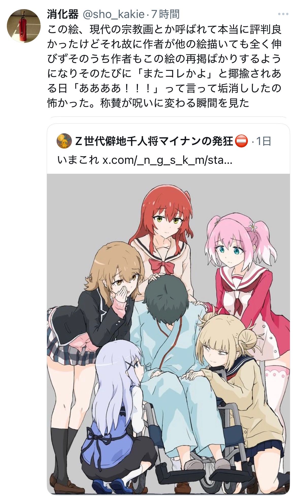 | … | 625/10/04(土)01:24:57No.1359424855そうだねx56今これがどういう状況指してるのかもこれの何が現代の宗教画なのかもわからん |