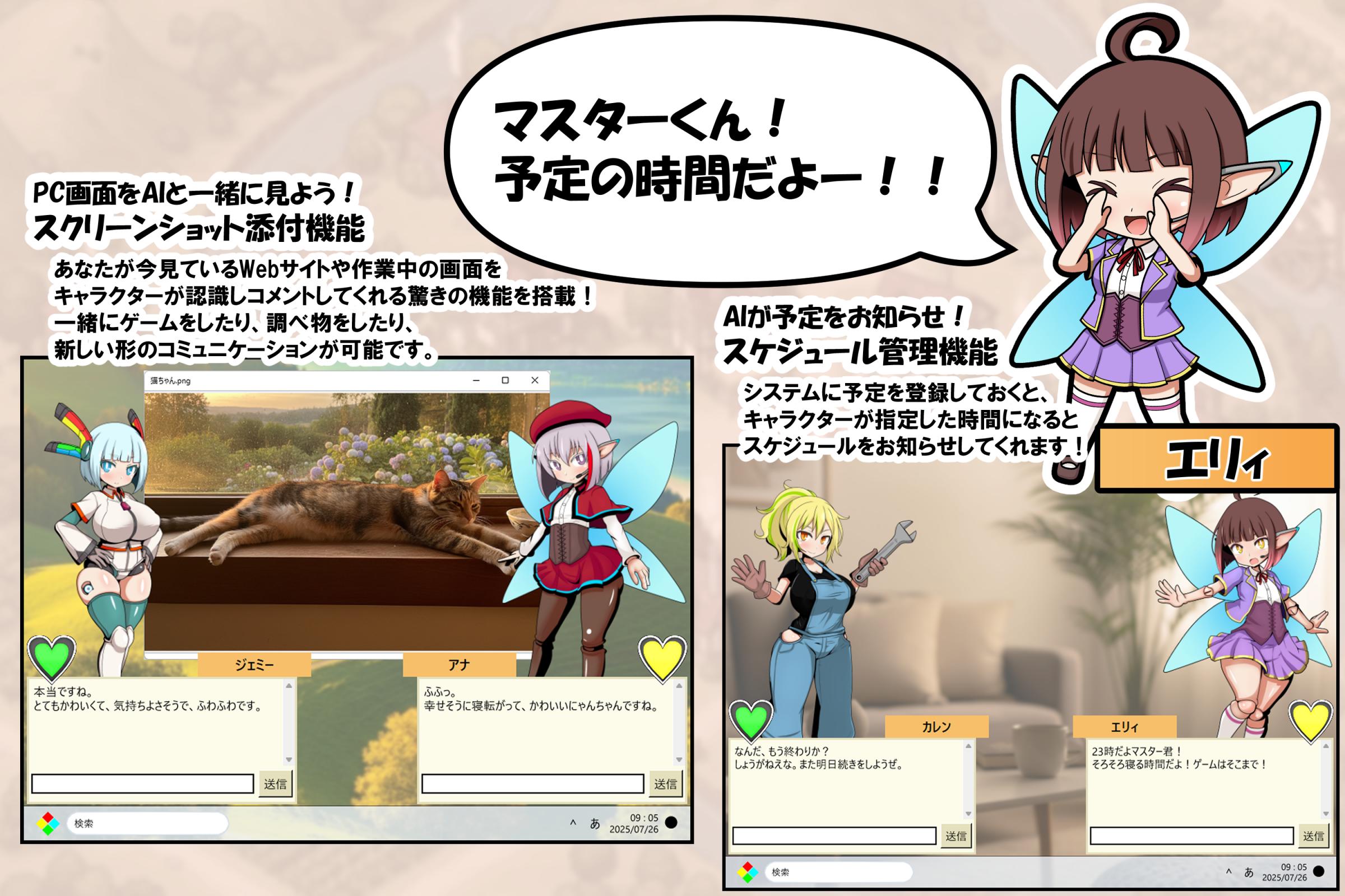 最大2キャラまで表示可能で勝手におしゃべりしてくれるほかお着換えやタッチもできるおおよそ「AIで動く伺か」なやつです