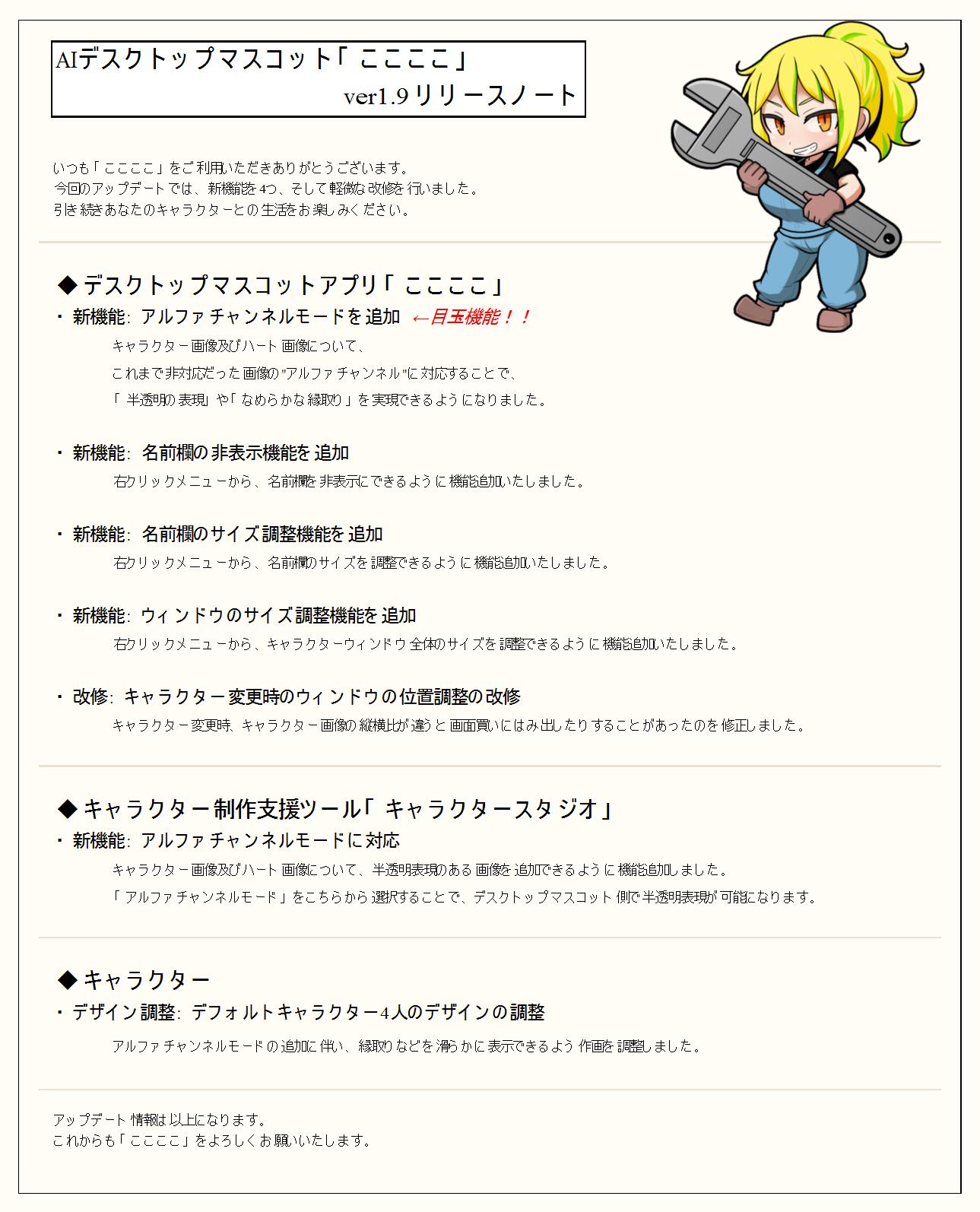 AIデスクトップマスコット「ここここ」ver1.9アップデートです