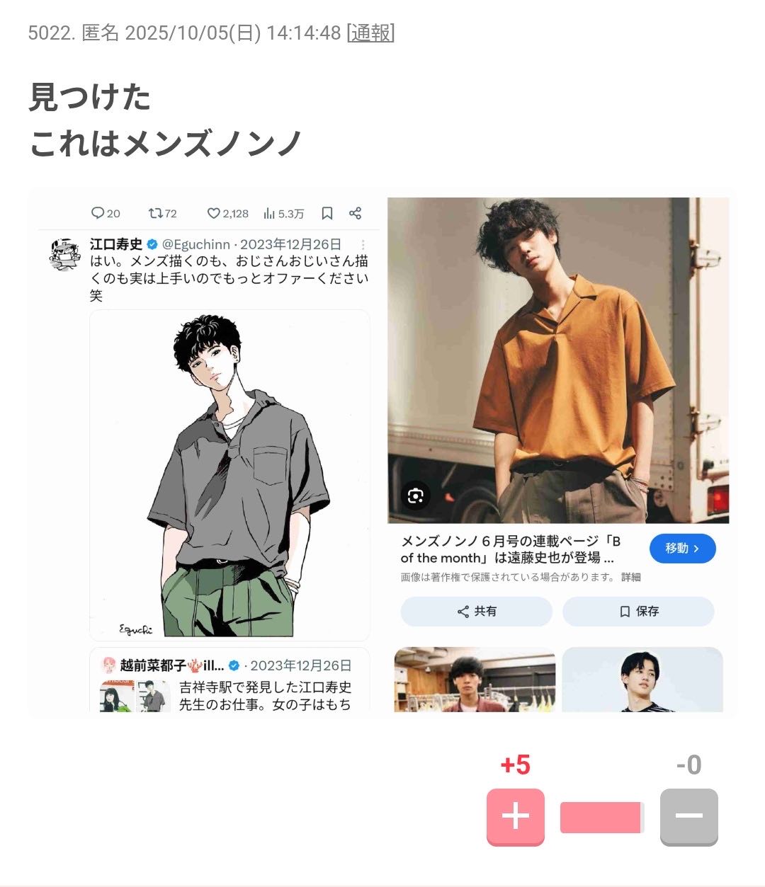 | … | 55325/10/07(火)15:58:46No.1360543289そうだねx5>こんな所で擁護してる暇あったら江口の絵でシコってろジジイ 君さっきから雑すぎて飽きられてるよ |