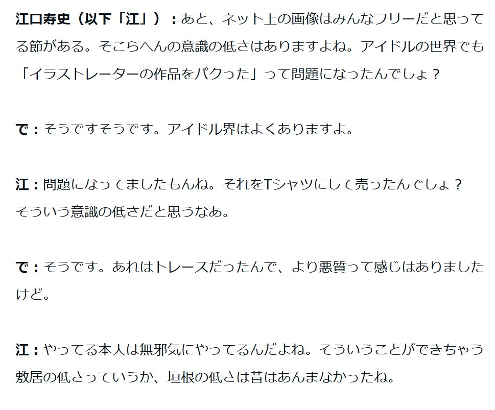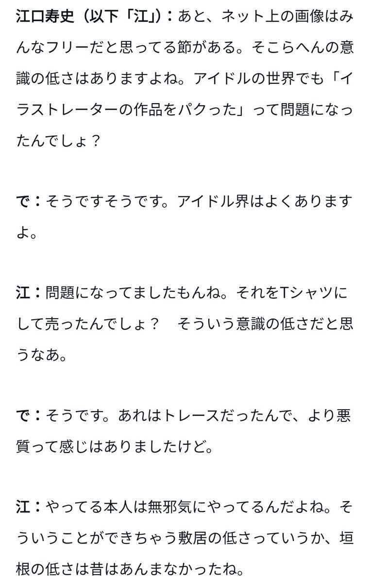 | … | 85725/10/08(水)21:40:47No.1360950495+>なにか勘違いしてるようだからちゃんと説明すると花沢健吾や浅野いにおが自分で用意した写真をトレスして漫画に活かしてる手法を江口寿史は愚痴愚痴言ってたって話だよ |