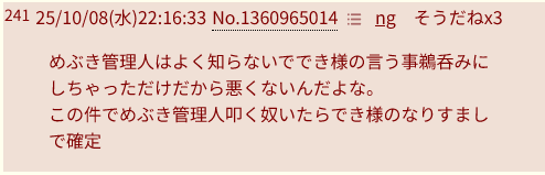 | … | 325/10/08(水)23:26:40No.1360989579そうだねx5めぶきの管理人を庇ってるからいつもの奴とは別なのか? |