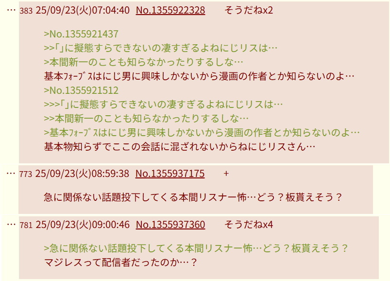 | … | 46925/10/09(木)00:54:29No.1361015766そうだねx1>にじ粘着ってにじリスの事? |