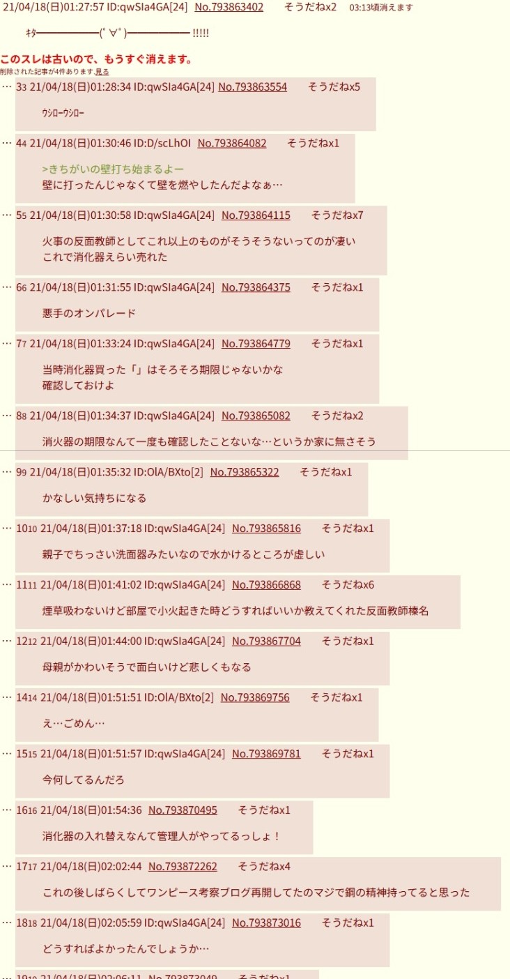 | … | 8125/10/09(木)01:54:11No.1361027227+ダンボールくべたのはまあダンボールで消せなかったから水持ってこようと慌てたんだろうなって |