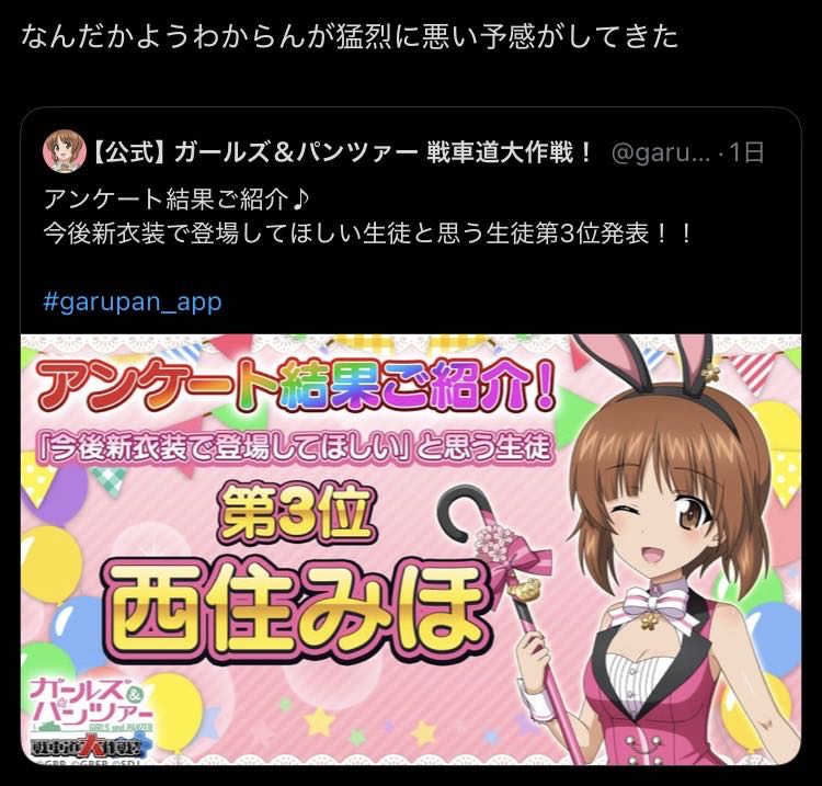 | … | 925/10/11(土)00:39:11No.1361597909そうだねx19>3位西住みほ |