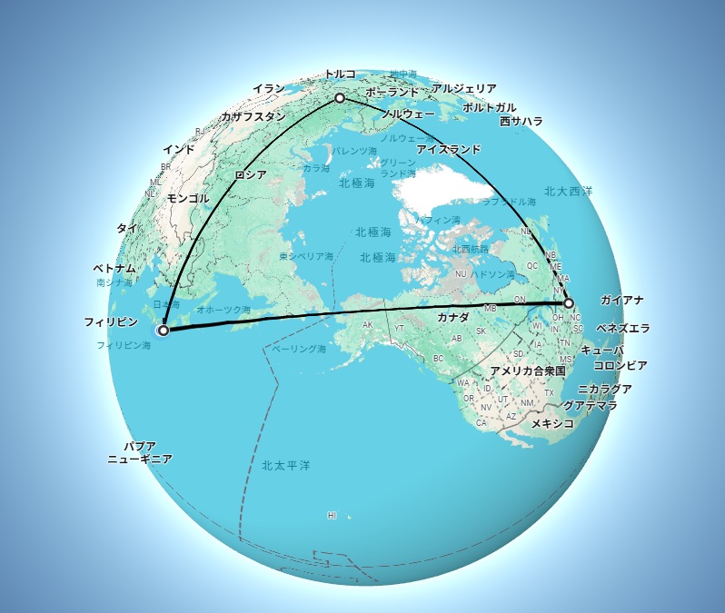 | … | 2525/10/11(土)18:03:32No.1361780210+ある点と点を結んだ直線はメルカトル図法図に反映すると曲線になるんだぜ |
