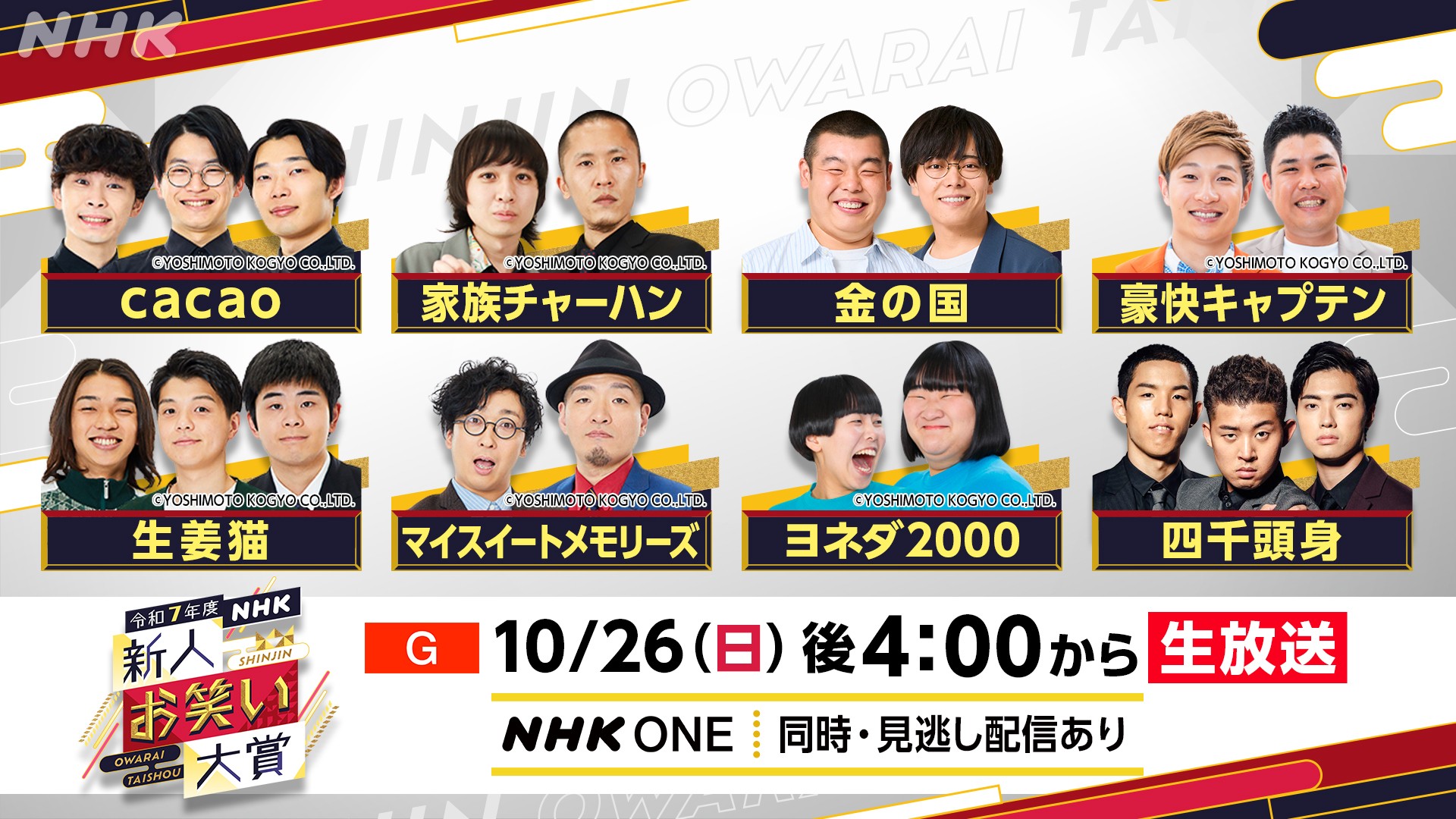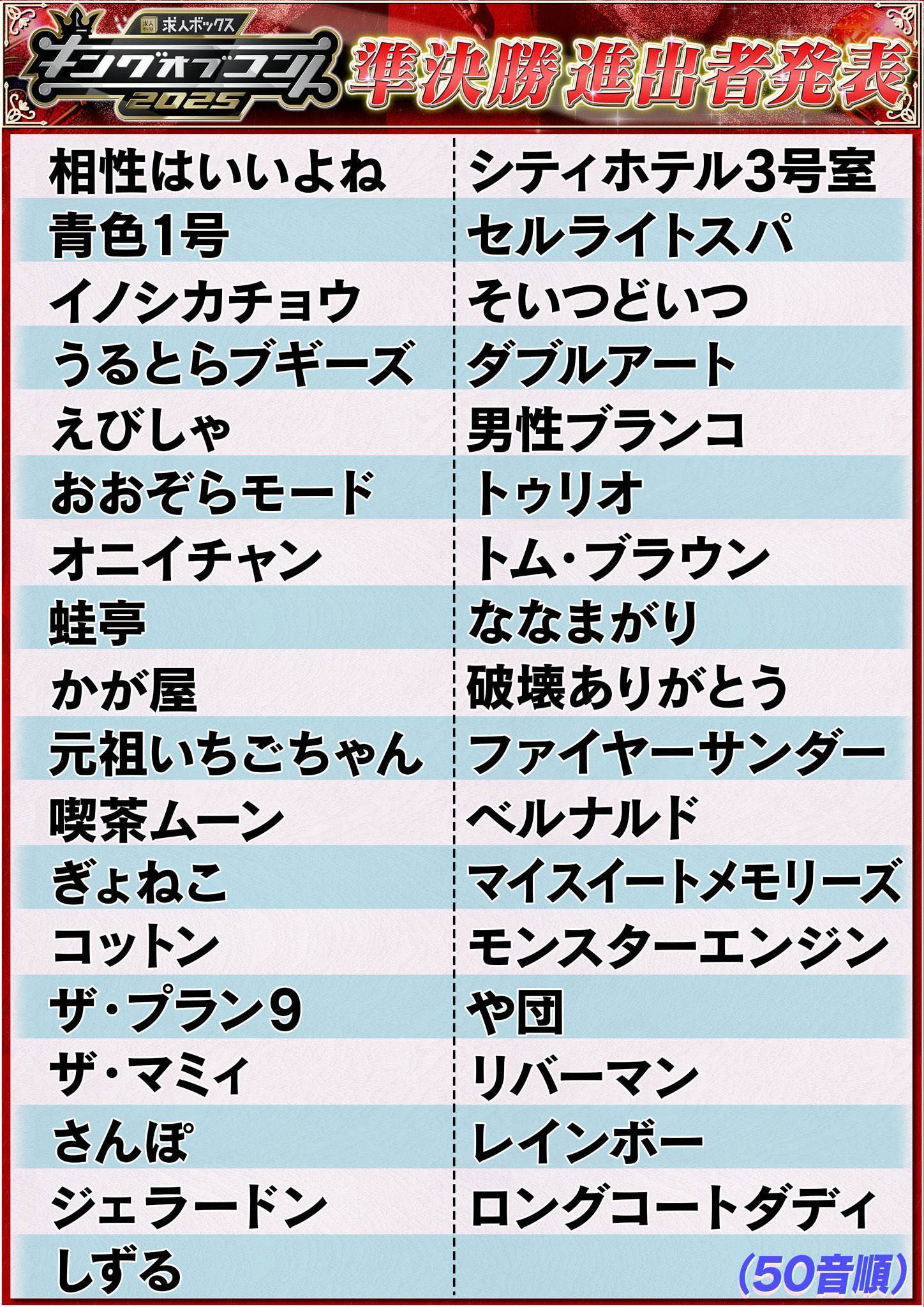 | … | 56325/10/11(土)22:55:47No.1361893779+>>昔のKOCは準決勝行った時点でネタじゃなくとも全国ネットに顔出せるチャンスではあったんだがな |