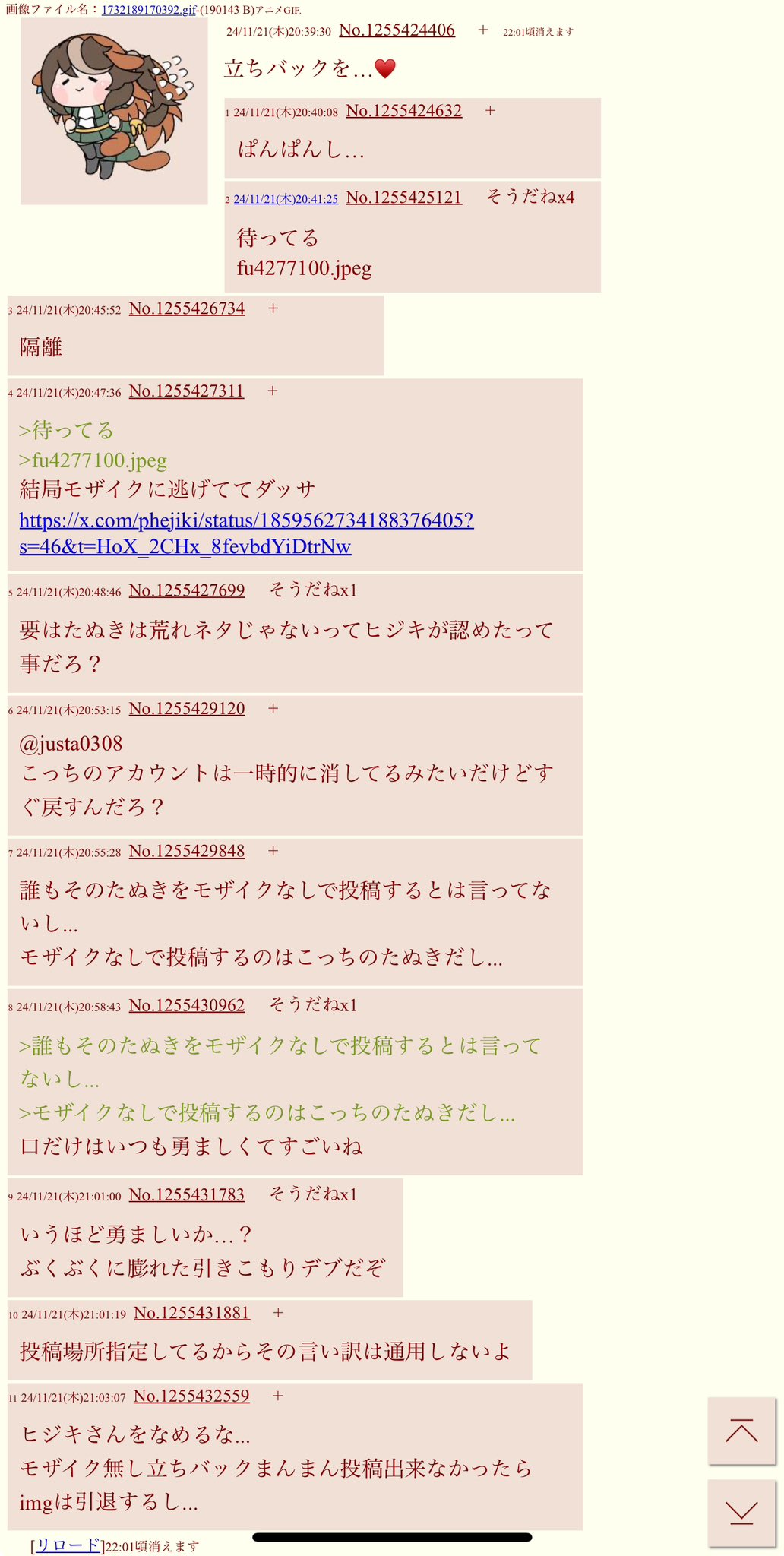 | … | 1825/10/12(日)01:26:15No.1361948760そうだねx22二次裏とV板とホロ板を荒らしているのはにじ粘着のホロ板住民でクンニもにじアンのホロリスらしいからな |