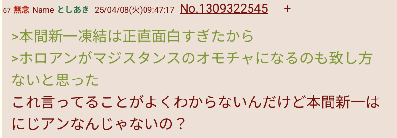 | … | 6325/10/12(日)11:34:38No.1362032566そうだねx4>にじ粘着失敗したからホロ粘着してるだけでしょ |