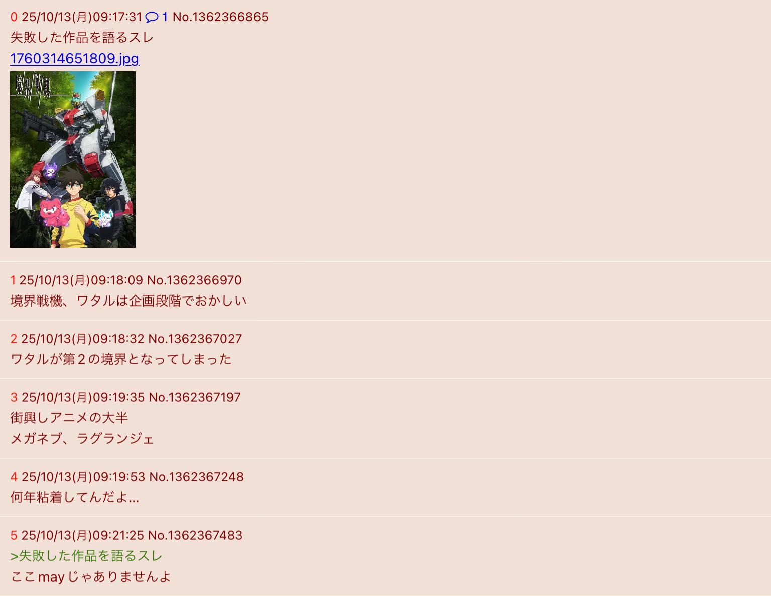 | … | 2025/10/13(月)09:46:22No.1362371923そうだねx9気に入らないロボットアニメはないこともないけどスレ「」のゴミカスに付き合うくらいなら喜んで見るよ |