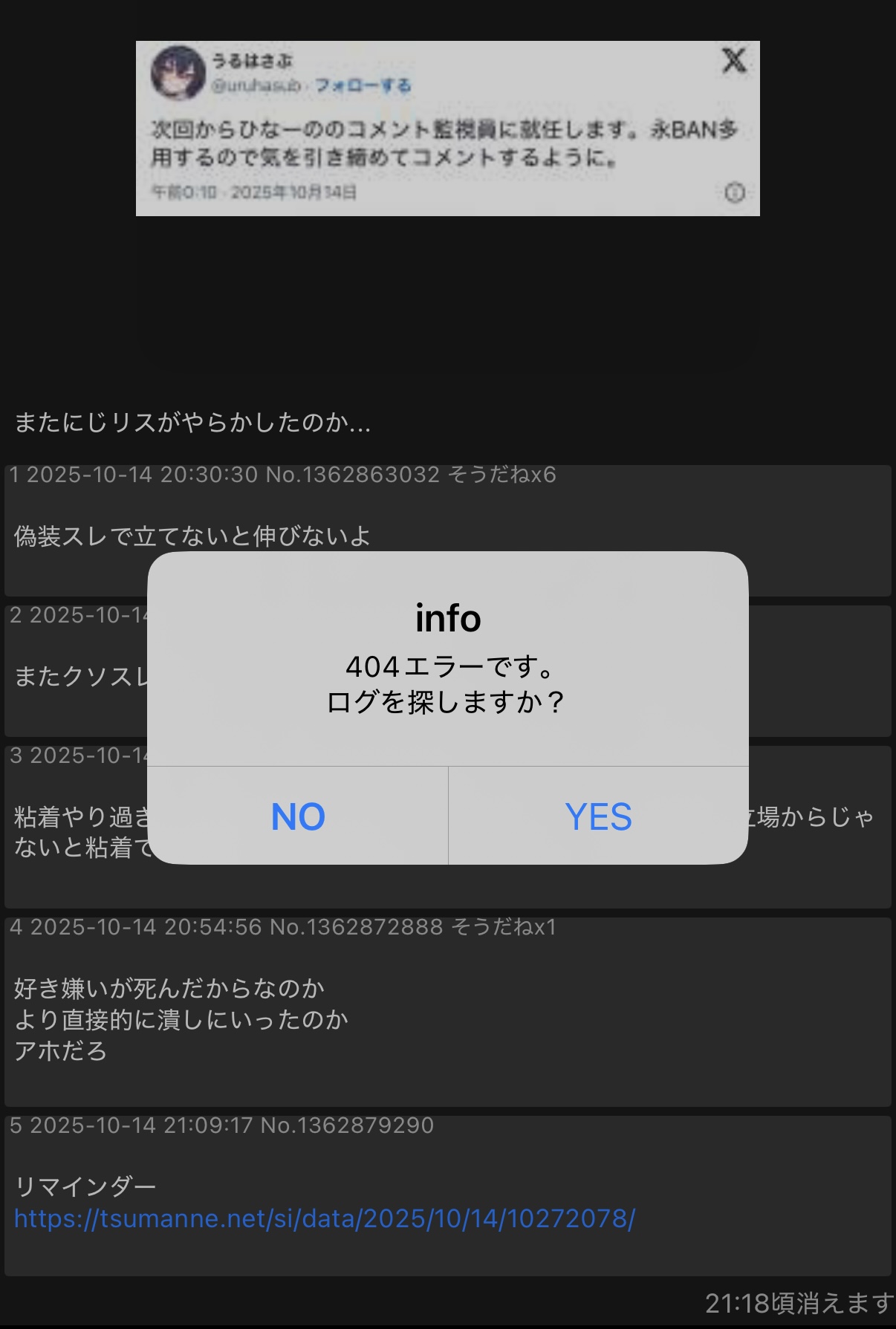 | … | 1025/10/14(火)21:09:39No.1362879444そうだねx13>ぶいすぽのついぷり画像のスレで荒らしをなんでもかんでもにじリスのせいにするなよ! |