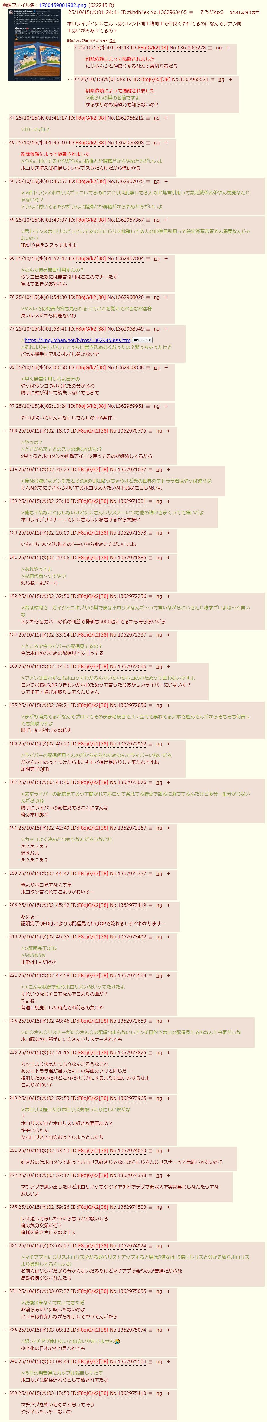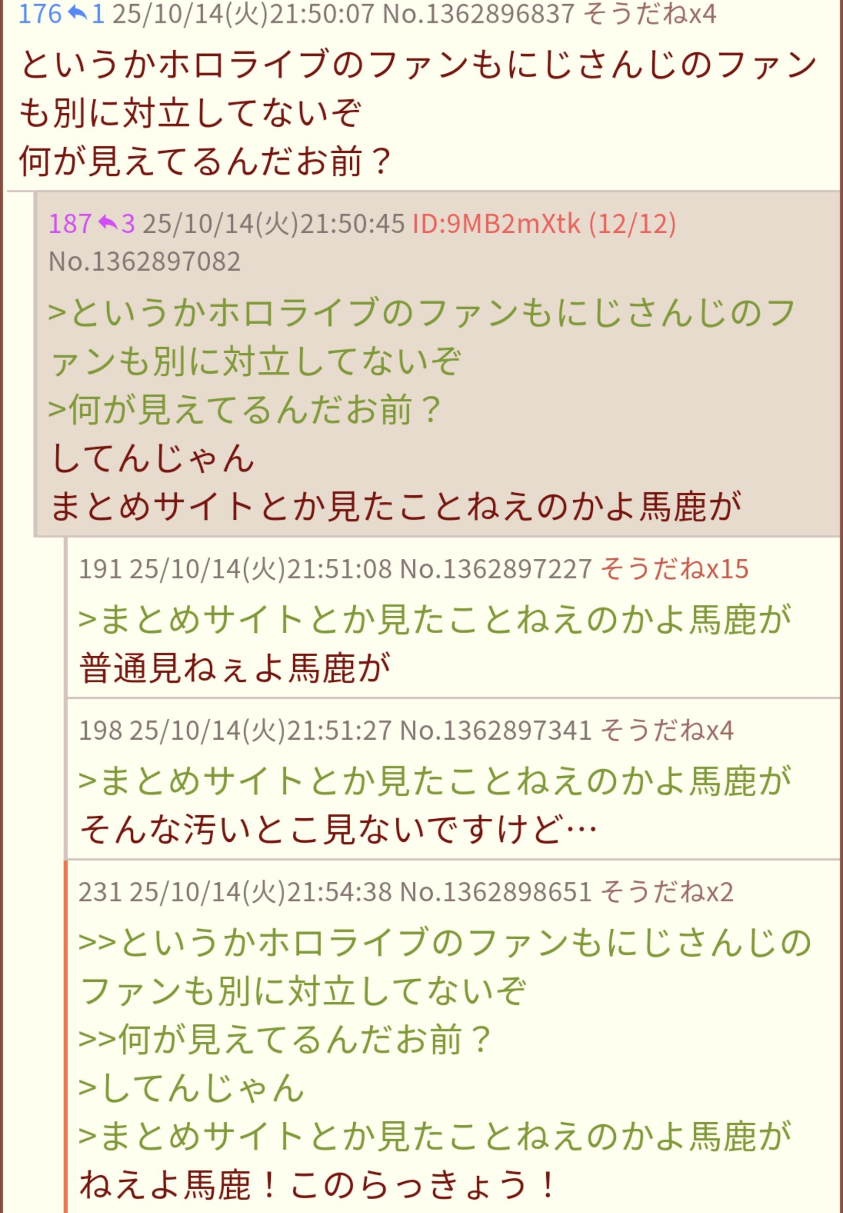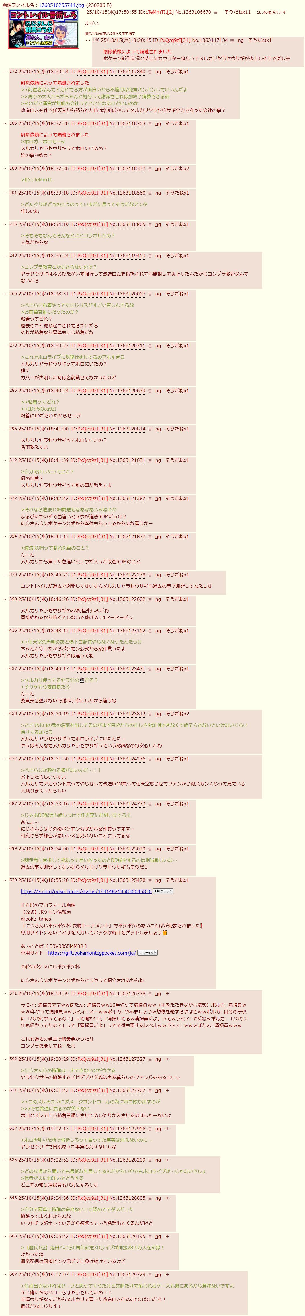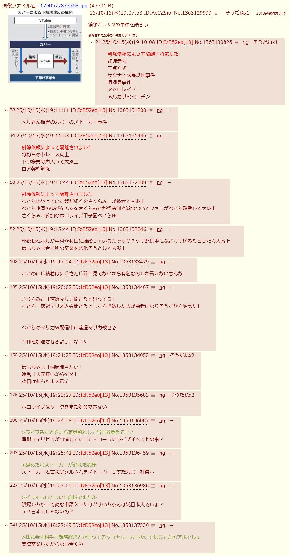 | … | 94025/10/15(水)20:20:56No.1363157249+頑張ってごまかしたところで葛葉含むにじさんじのやらかしはなかったことにならんよ |