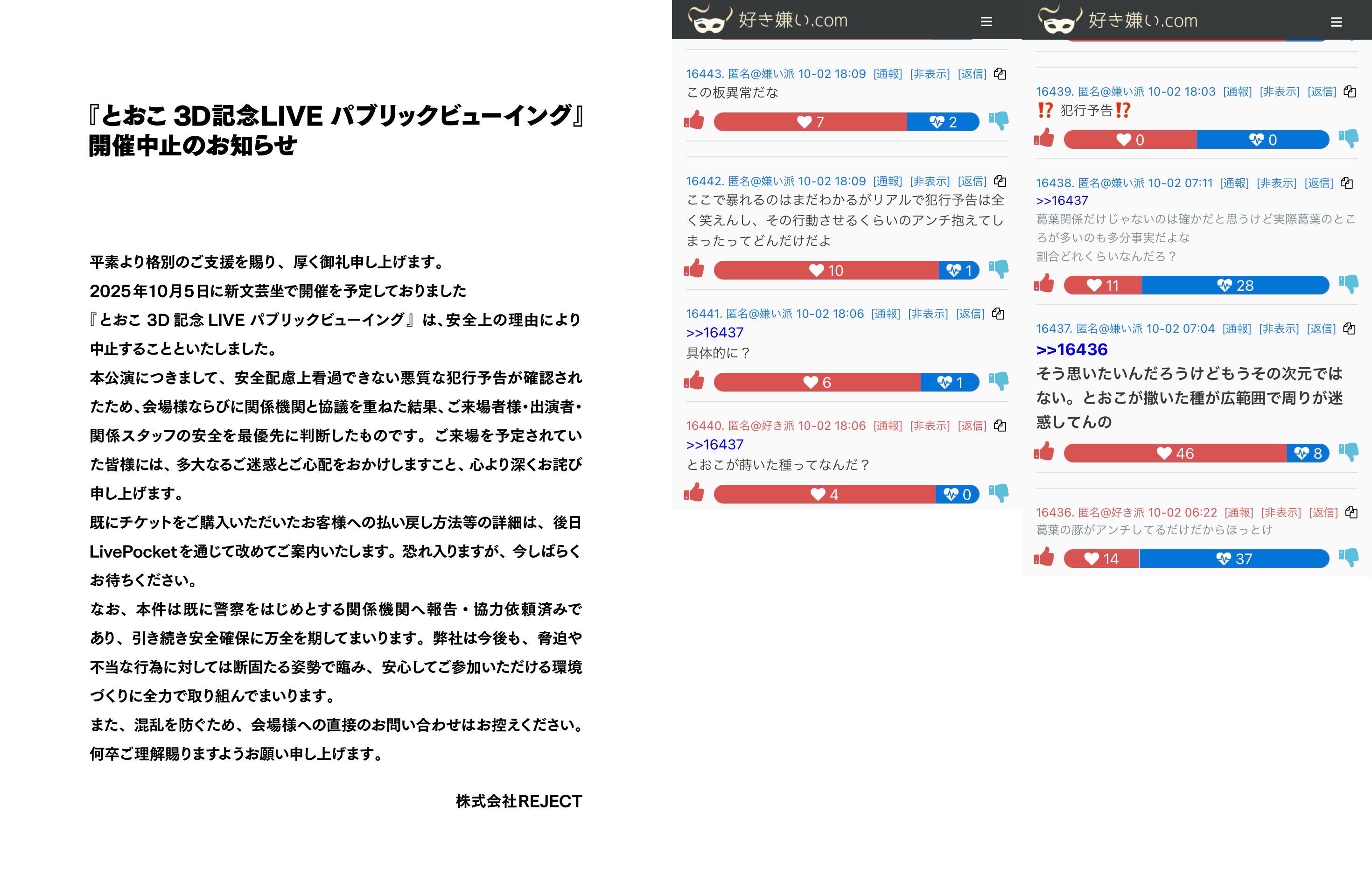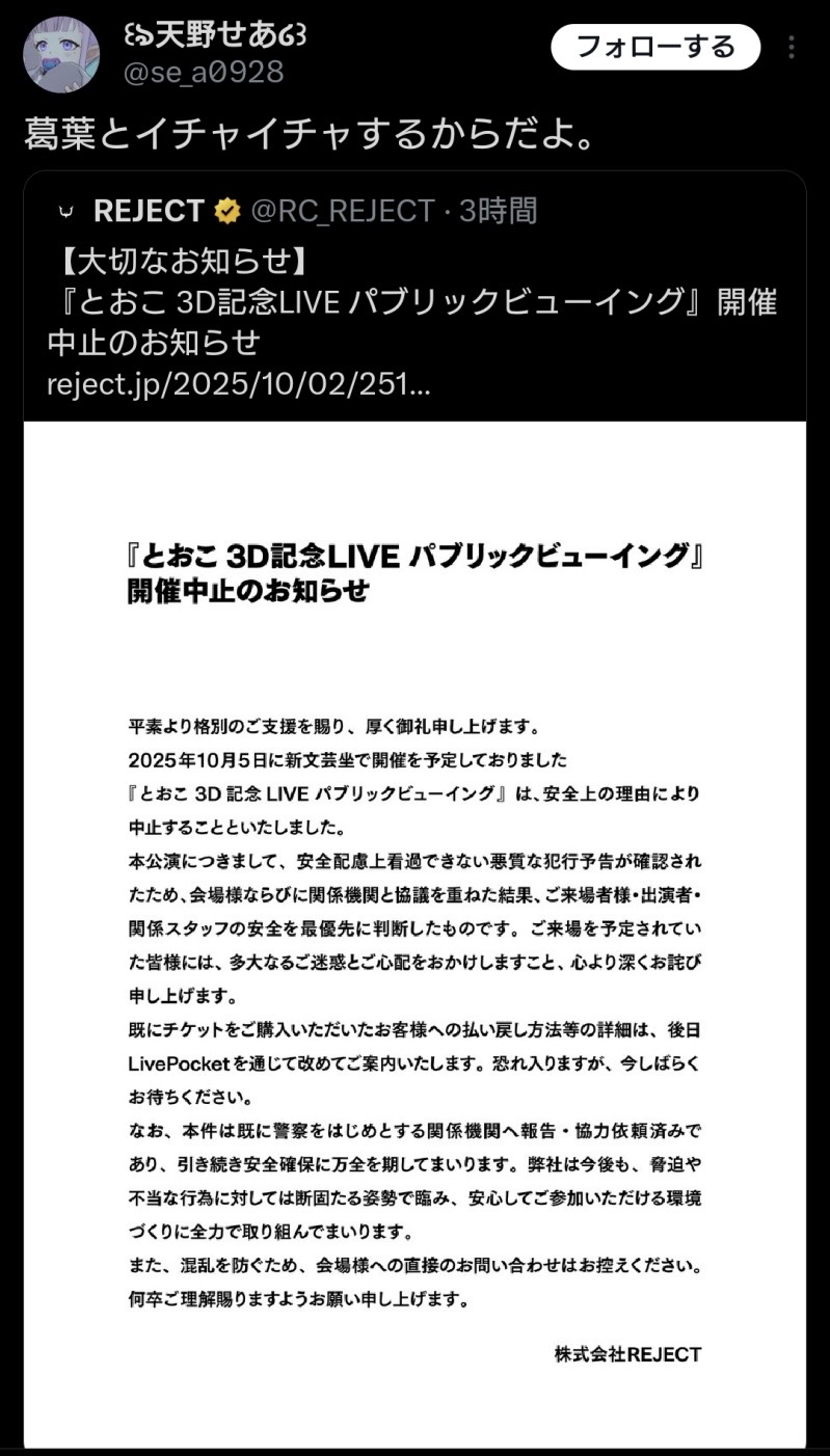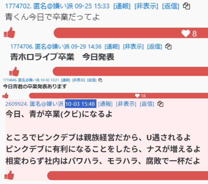| … | 1025/10/15(水)19:09:29No.1363130605そうだねx23辞めた後に実はやめてましたって公式から声明文出たやつ |