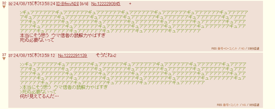 | … | 38625/10/15(水)21:36:05No.1363185795そうだねx4>なんかウマガイジ湧いてきて萎えたわ |