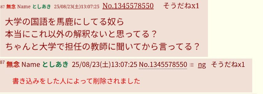 | … | 1925/10/15(水)20:34:52No.1363162566+>まあ誤字は面白いけど言ってる事自体は正論じゃん |
