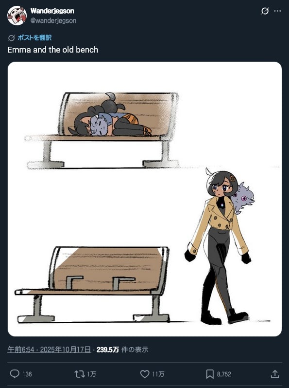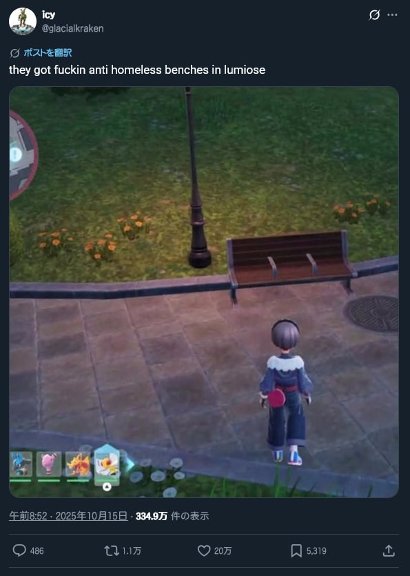 | … | 3625/10/19(日)09:11:02No.1364226832+そもそもマジでホームレス対策ベンチあるじゃんって程度の意味がこんなにバズるわけなくない? |