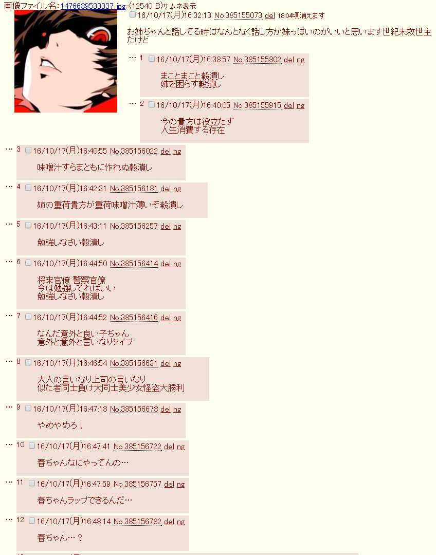 | … | 6925/10/22(水)22:22:14No.1365387446そうだねx1結局この自称妹はどなた様なんだよ!!!! |