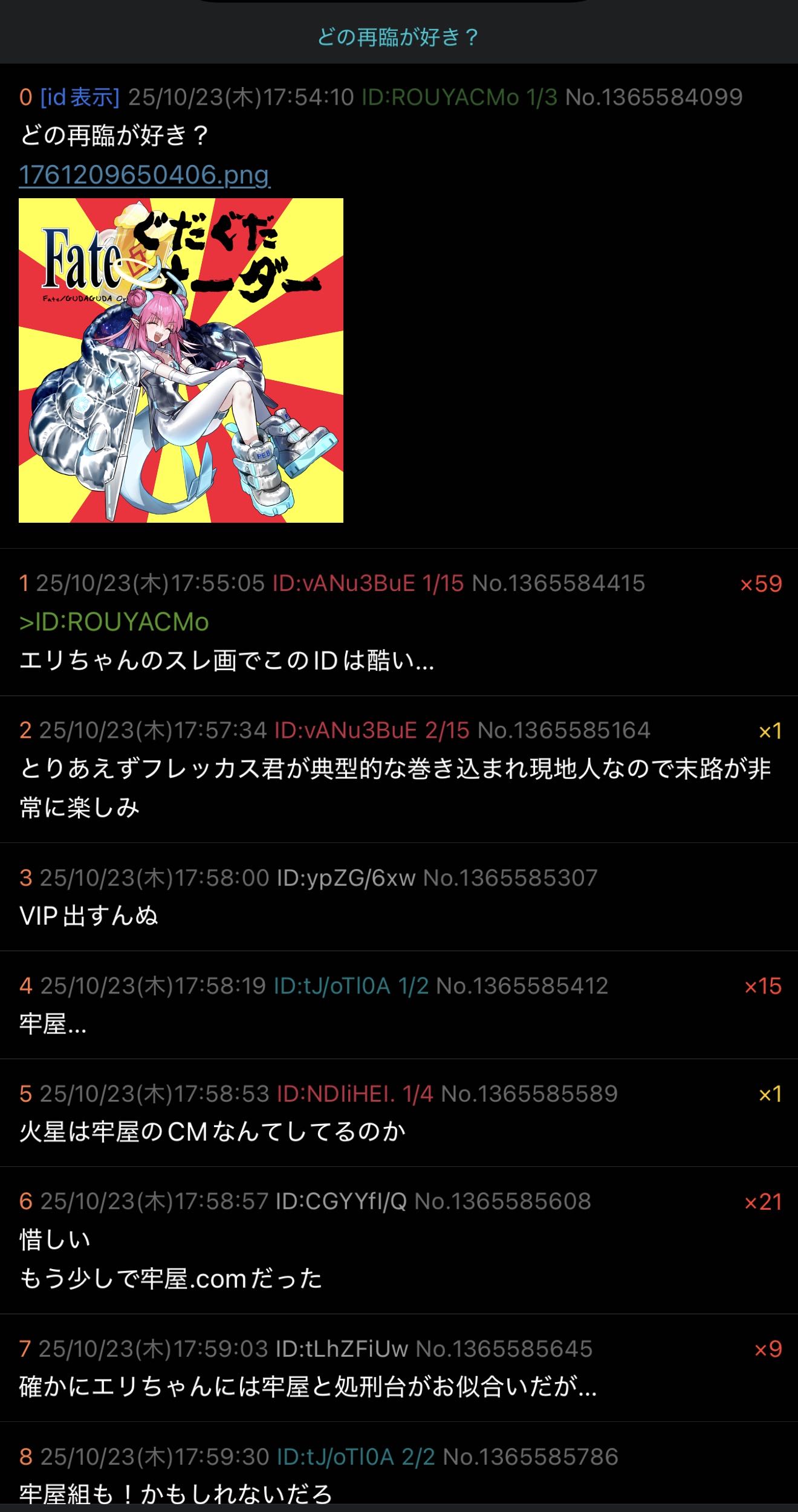 | … | 825/10/23(木)17:59:30 ID:tJ/oTl0ANo.1365585786+牢屋組も!かもしれないだろ |