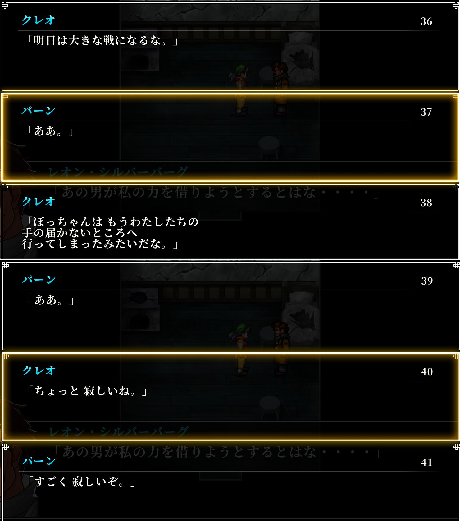 | … | 11525/10/27(月)12:48:53No.1366802303+序盤のパーンはライブ感で動くクレオに対してテオへの忠義を優先したりする冷静よりのキャラだったんだが |