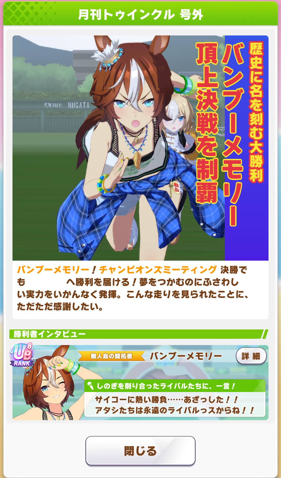 | … | 1925/10/28(火)13:23:28No.1367114428+最初にすげー何となく育成した秋ミラクルが勝ってプラチナなのだ |