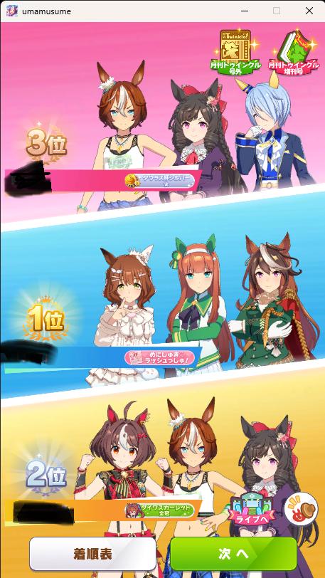 | … | 8325/10/28(火)13:46:09No.1367120093+>今まではウマ娘ラボの言うこと丸齧りで中々勝ちきれなかったのに今回は無視して前方脚質中心で戦ったらプラチナ取れたのだ |