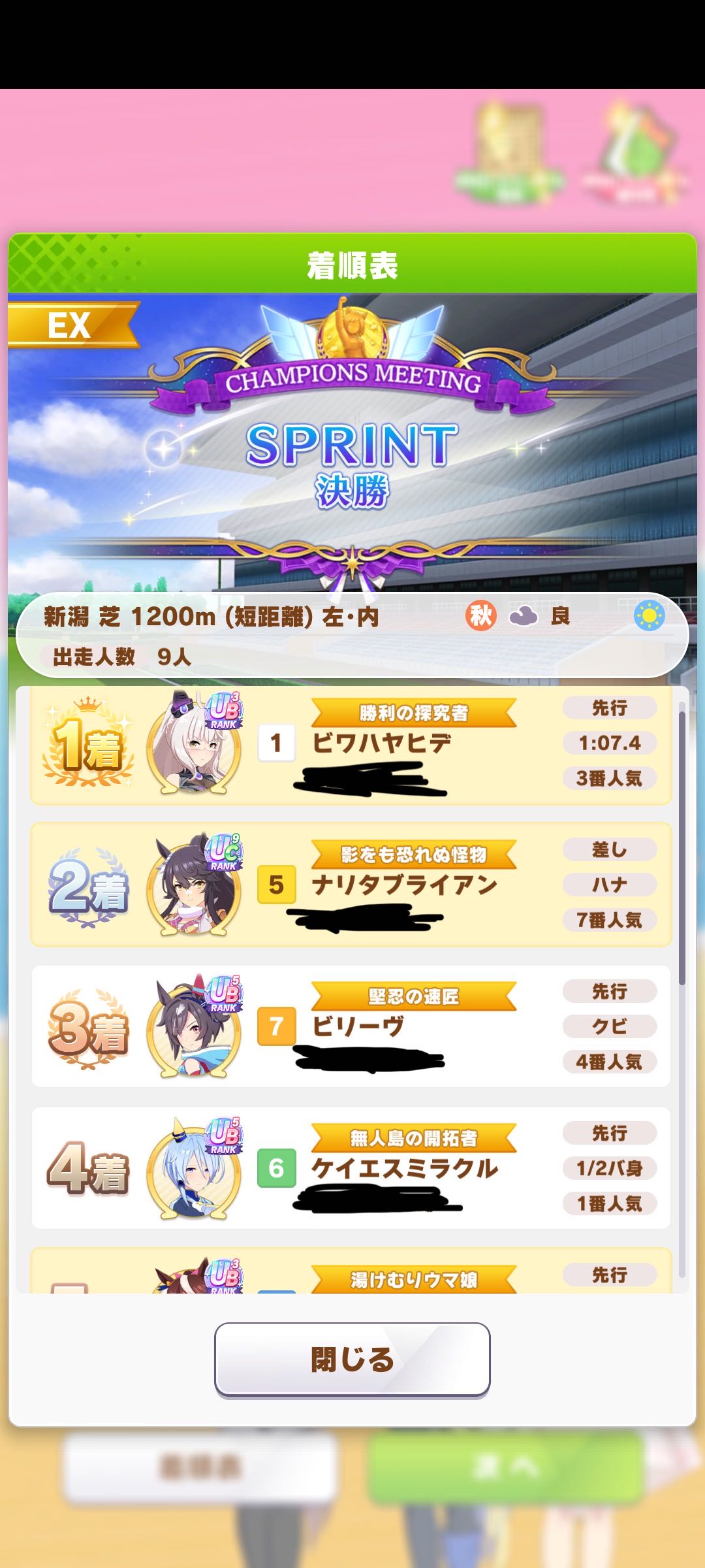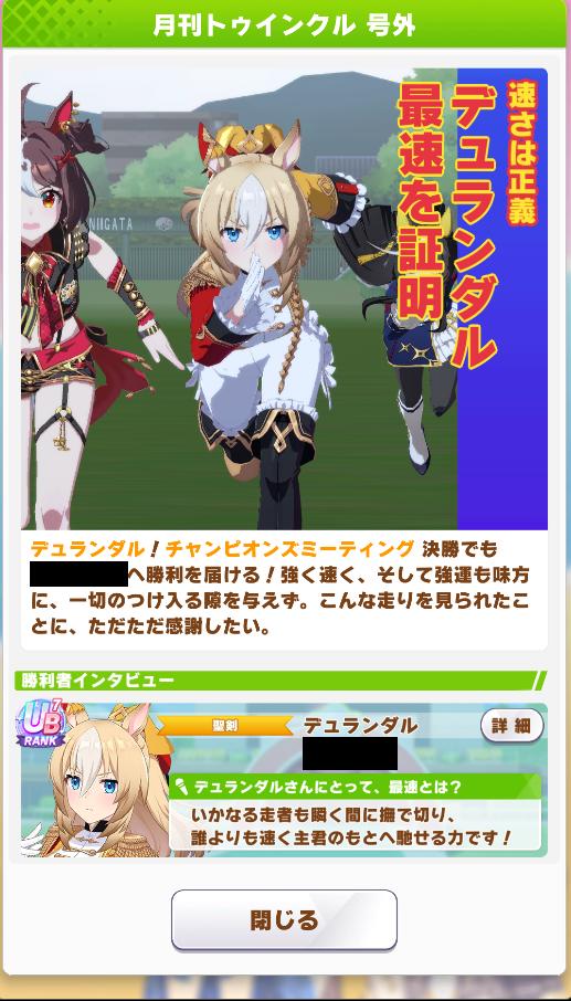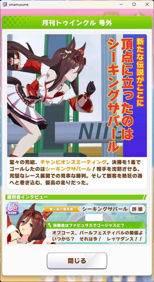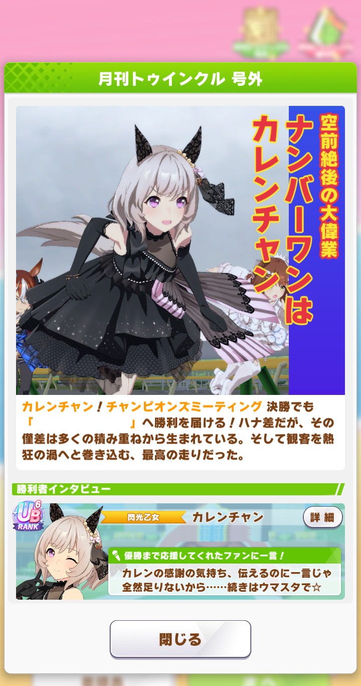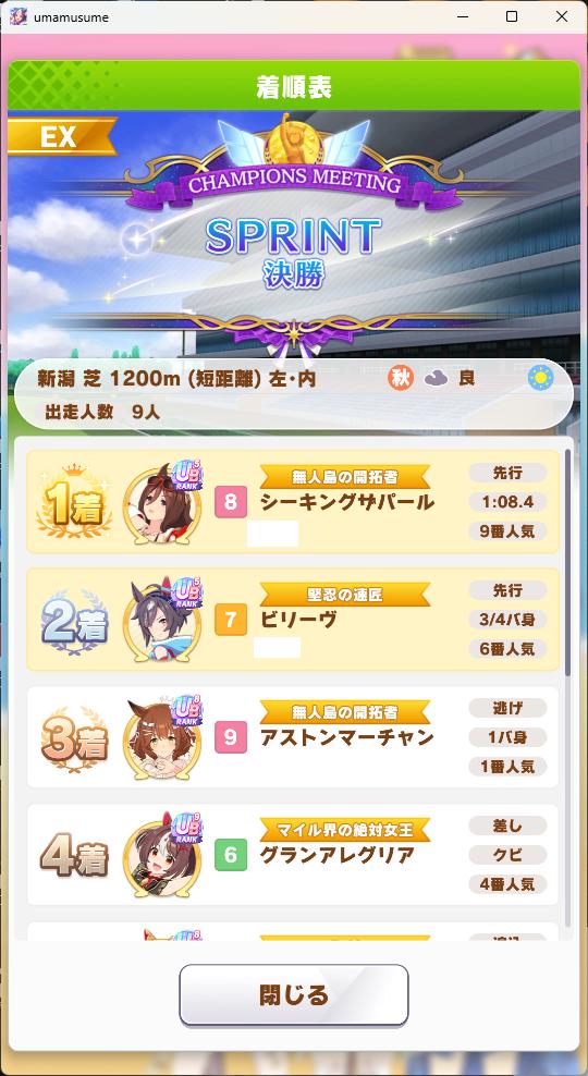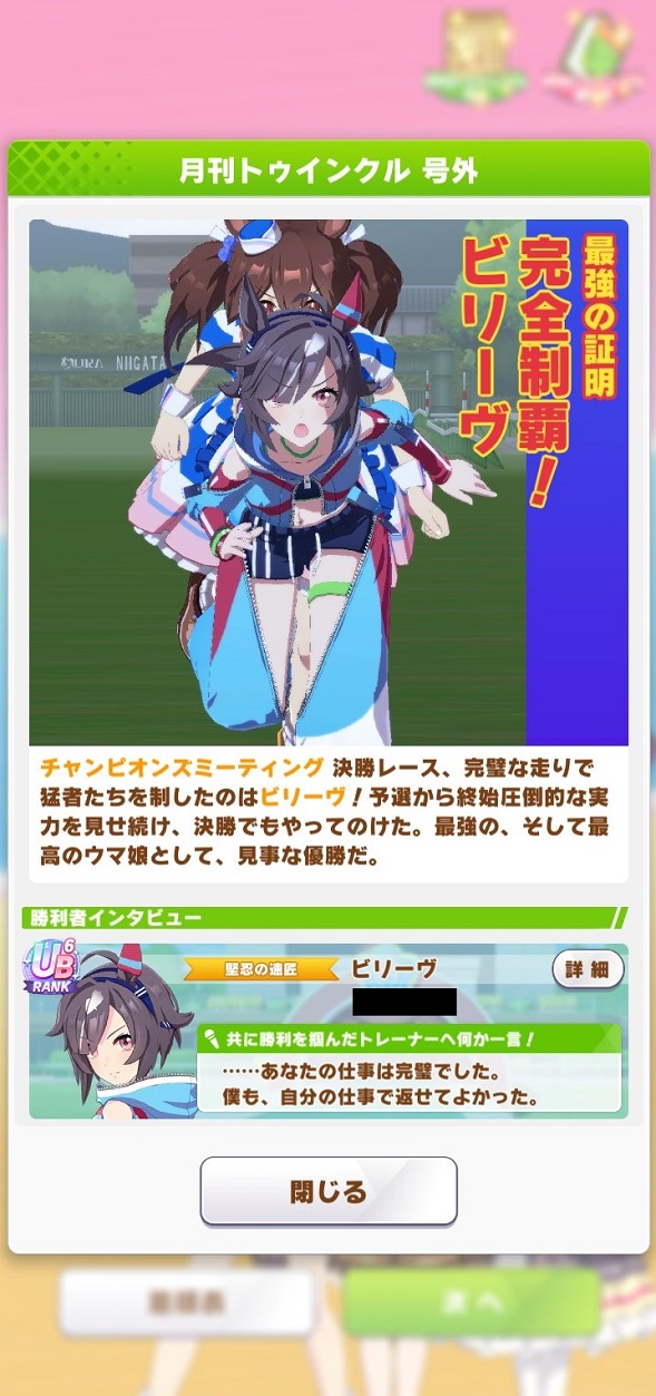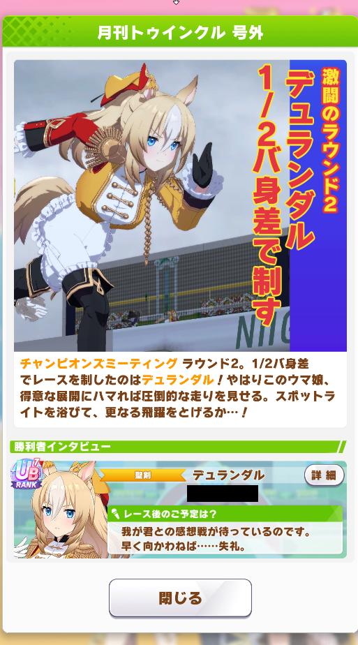 | … | 8925/10/28(火)18:40:22 ID:wJKT.u2INo.1367191788+終盤まではすごくいい展開だったんですが内ラチから来てたキングちゃんに差し切られて2位でした… |