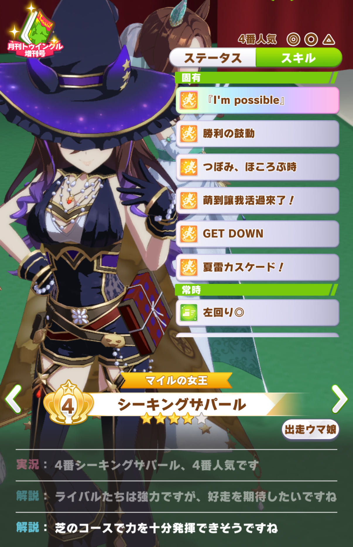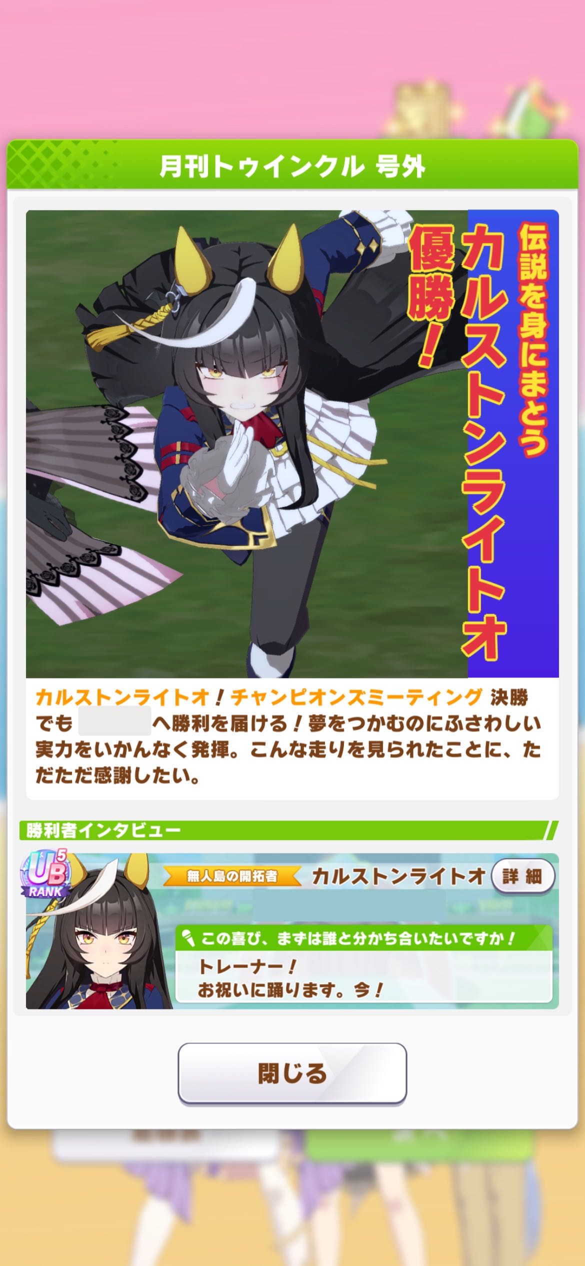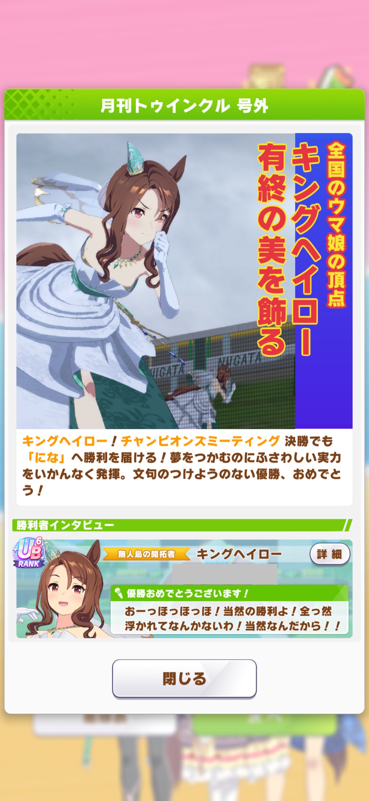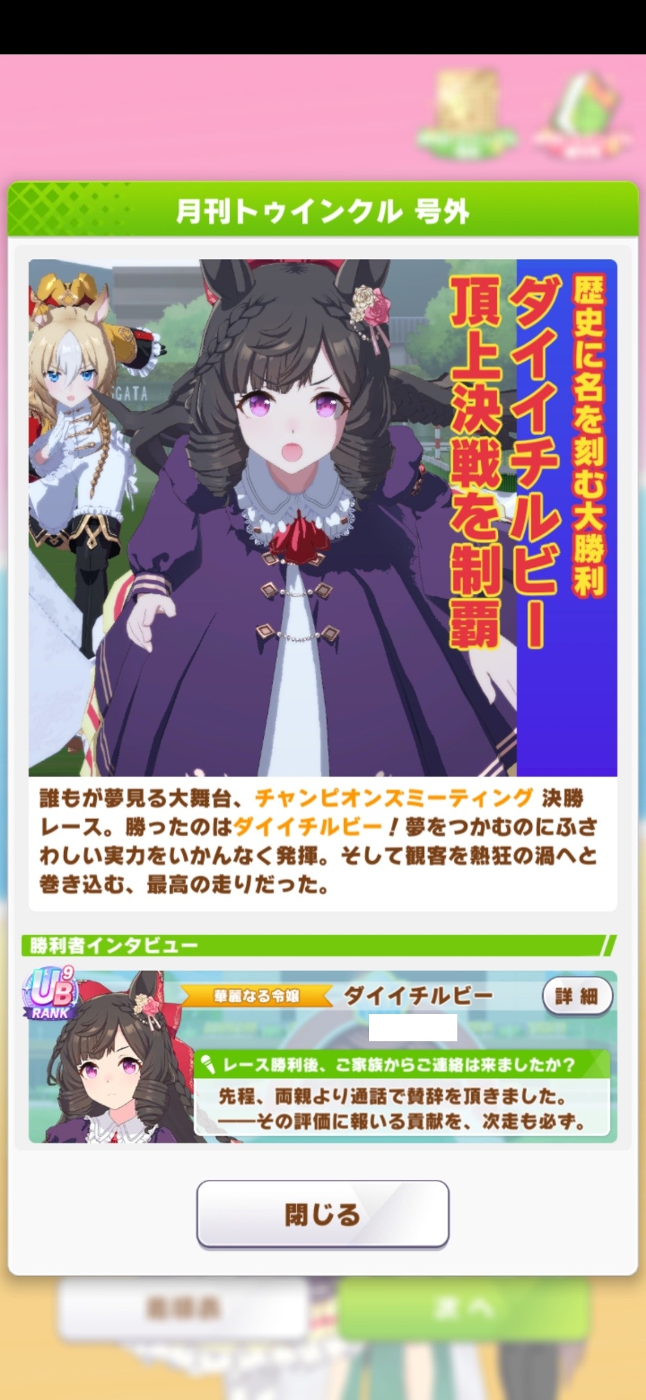 | … | 8925/10/28(火)18:40:22 ID:wJKT.u2INo.1367191788+終盤まではすごくいい展開だったんですが内ラチから来てたキングちゃんに差し切られて2位でした… |