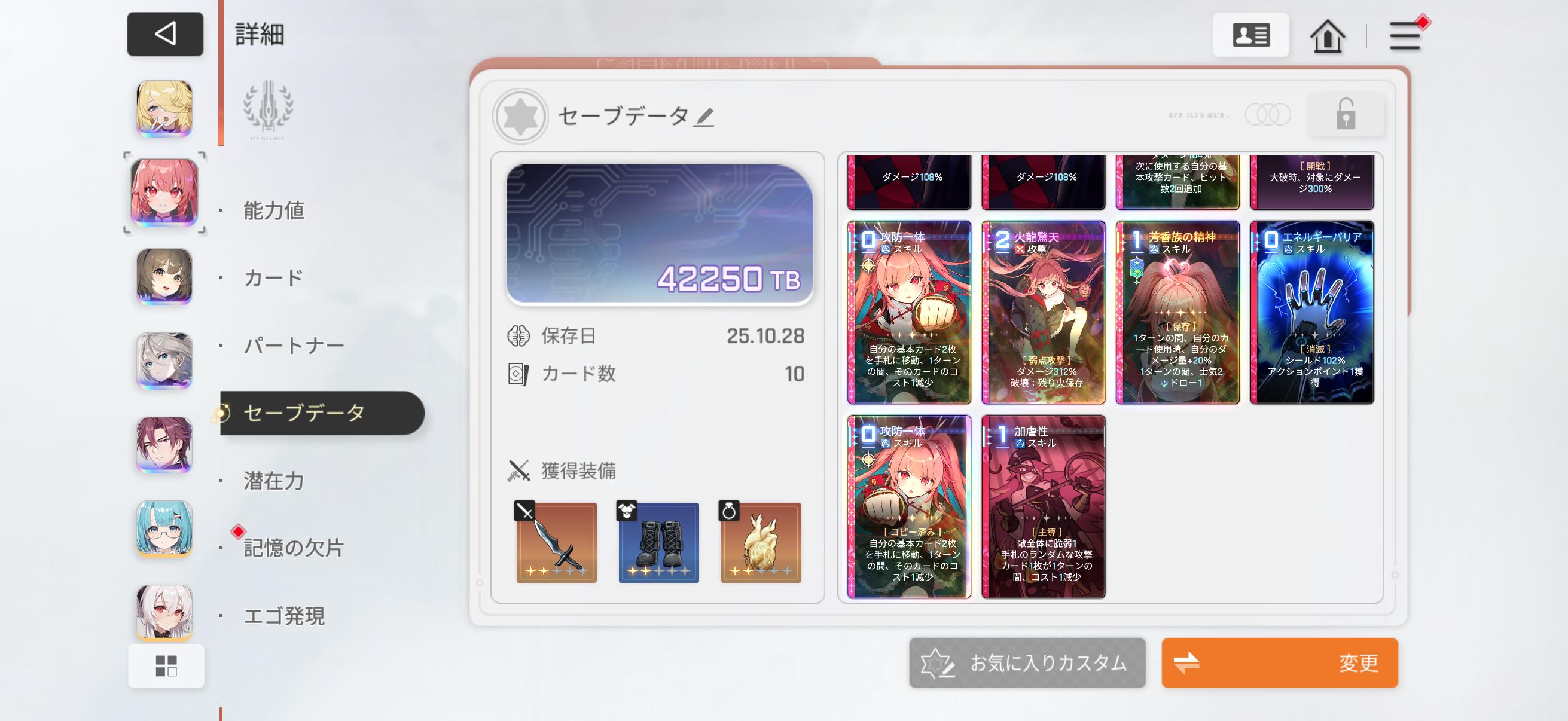| … | 41325/10/28(火)19:00:40No.1367197908そうだねx1>キャラごとに固有4枚基本4枚だけだからキャラ編成以外の部分だと味変要素ってひらめきくらい…? >装備はそこまで劇的に強いの見たことないし >でも固有ひらめきとか必ず出るわけでもないよね 共有カードが雑に強くて中々の味変要素になる |