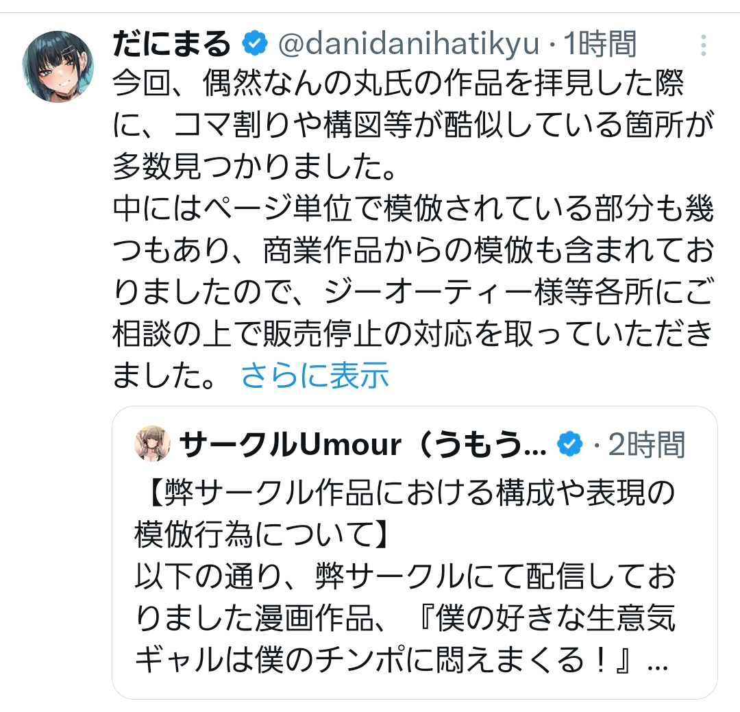 | … | 1025/10/28(火)22:17:47No.1367291069そうだねx1義母義妹とやりまくる漫画の2巻もページ丸々パクってた記憶あるけど名前が思い出せない |