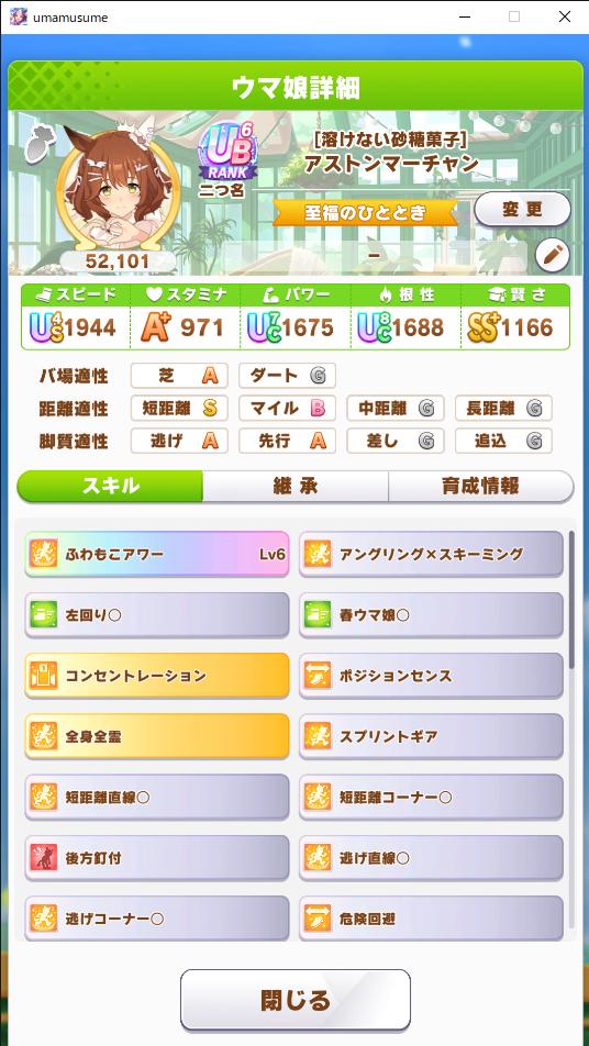 | … | 225/10/29(水)18:39:11 ID:0AiAaKsUNo.1367514219+何回か育成したんですがこれはスピ2にするのが安定ですかね…? |