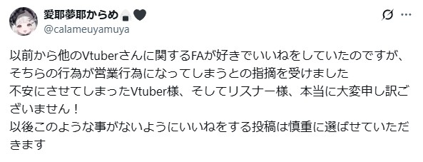 | … | 3425/10/30(木)12:03:42 ID:6QoDo9YcNo.1367721325そうだねx1いいねされた絵師様がVライバー本人に弱小ごときが営業掛けるな!とキレてVが運営に相談して運営判断でお気持ち表明とか? |