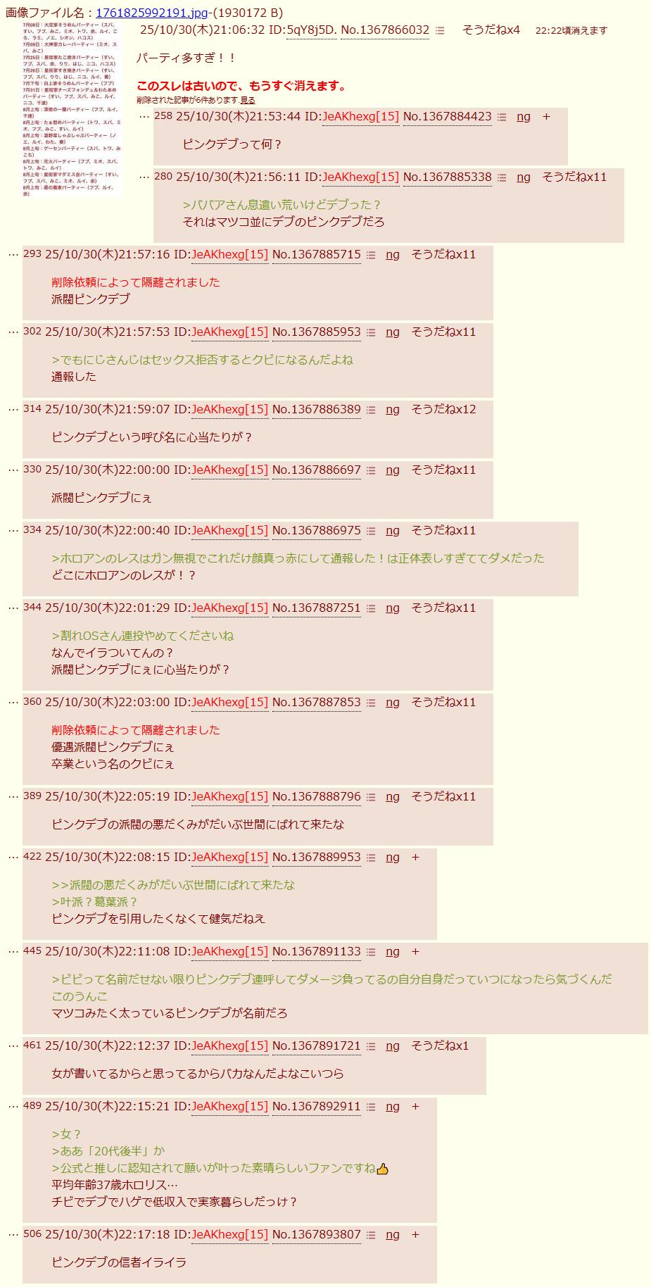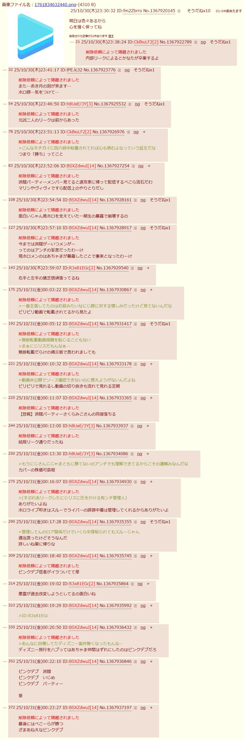 | … | 4525/10/30(木)23:44:11No.1367924685そうだねx19>>内部リークによるとかなたが卒業するよ |