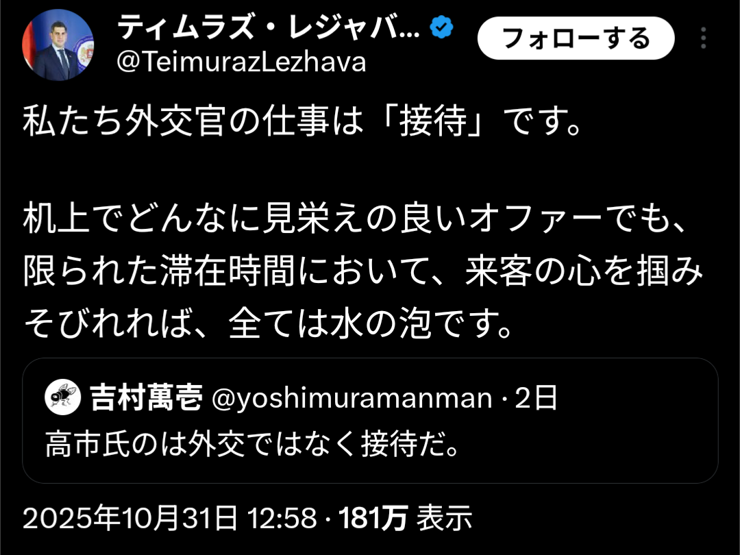 | … | 825/10/31(金)18:47:41No.1368111290そうだねx2>外交官と同列で語られてますよ |