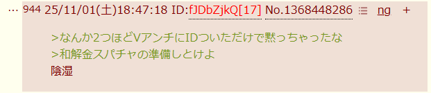 | … | 94125/11/01(土)18:47:06No.1368448219+>>なんか2つほどVアンチにIDついただけで黙っちゃったな |