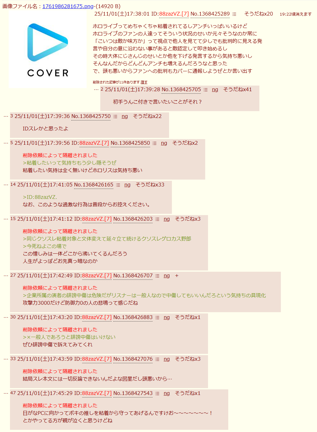 | … | 2025/11/01(土)17:41:48No.1368426362そうだねx27企業所属の演者の誹謗中傷は危険だがリスナーは一般人なので中傷してもいいんだろという気持ちの具現化 |