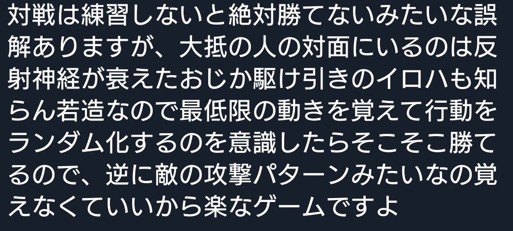 | … | 8725/11/02(日)01:53:56No.1368594569そうだねx3同じくらいの腕前のランクマにいる中身が人の相手なんて強く調整されたNPCや何十回と負ける死にゲーのボスよりは勝てない相手じゃないはずだろ(負けることあれど例えば同じ相手と何戦かしたらするっと勝つこともあるはず)ってのは確かにわかる |