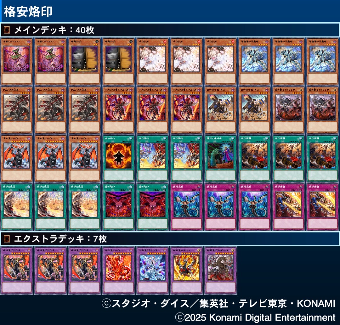| … | 16025/11/03(月)20:28:01No.1369208272+>烙印ストラク+スレ「」のカード資産状況でできるだけ安そうな烙印組んでみた |