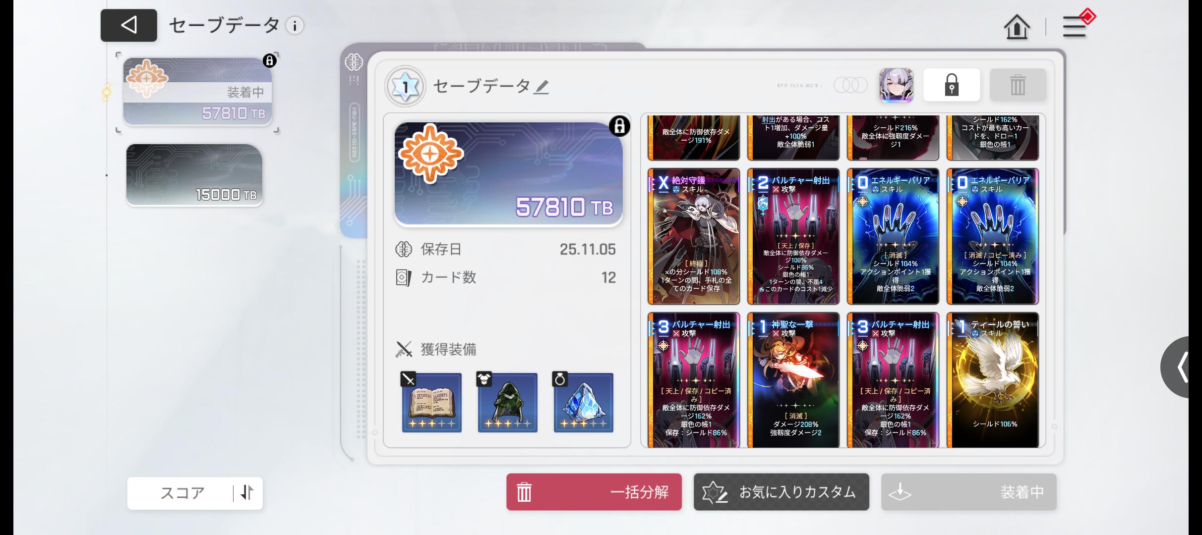 | … | 35925/11/05(水)21:58:31No.1369829032+>さっき難易度9の削除について相談した「」だけど結局1枚残しの基本2枚削除でも消したカード全部戻ってきてコピーしたカードも神ヒラメキも消されました⋯ >非常に高いで破損もしてないのにこのざまとは ☆4装備で基本カード全消ししてカード5枚のデータ見たんだけど神ひらめきもコピーも無しだったからやっぱ正攻法だとそこらへんの両立は難しいのかも |