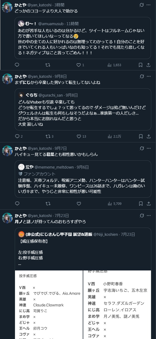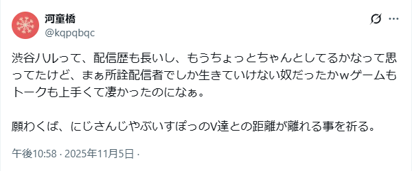 | … | 64925/11/06(木)15:26:32No.1369998289+>そういう話しだすなら渋ハルもにじさんじも加藤純一界隈の人間だからただの内ゲバっすねで話終わっちゃうじゃん |