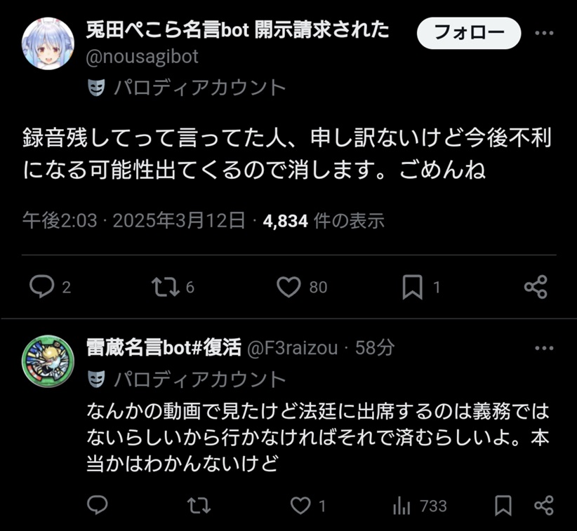 | … | 7025/11/06(木)13:46:32No.1369978843そうだねx3有名税とか本気で信じてそうで怖いよねこの手の人達 |