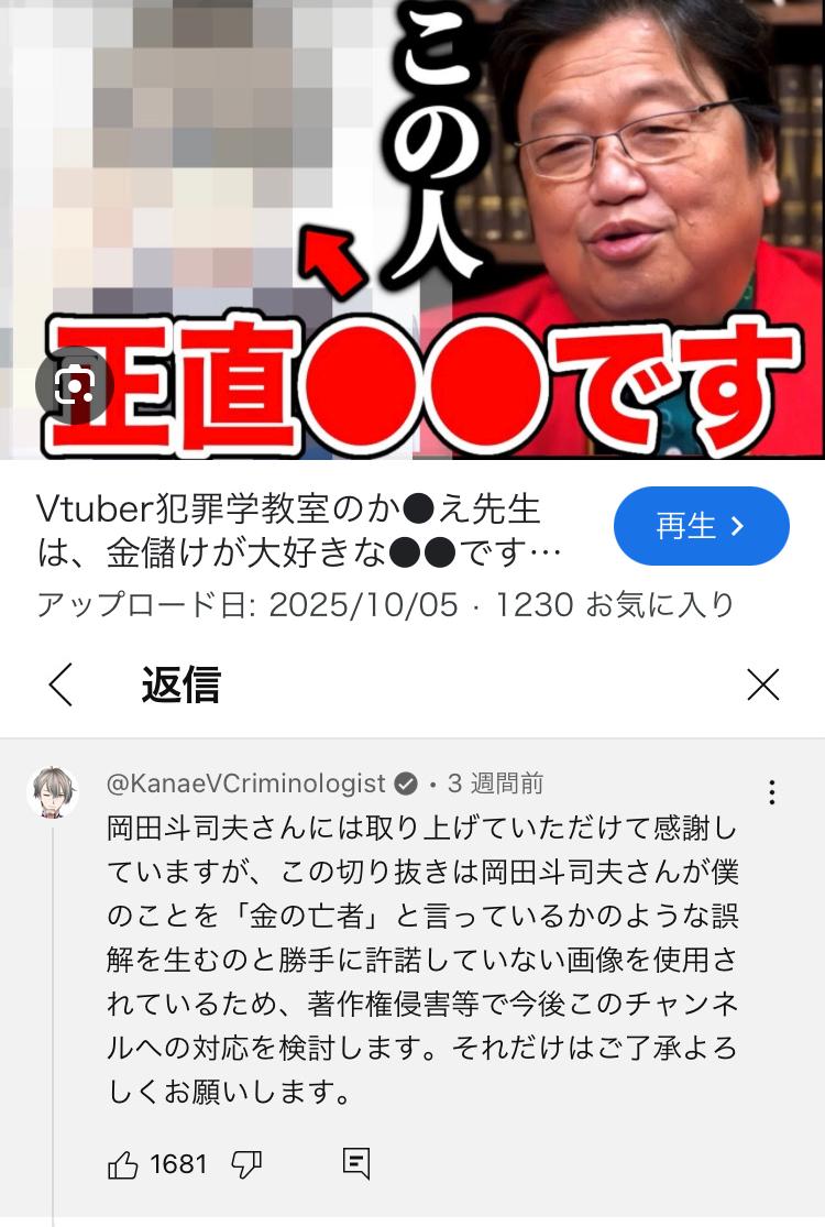 | … | 5925/11/06(木)13:42:32No.1369977961そうだねx7>粘着が配信者に反論されて逆ギレした |
