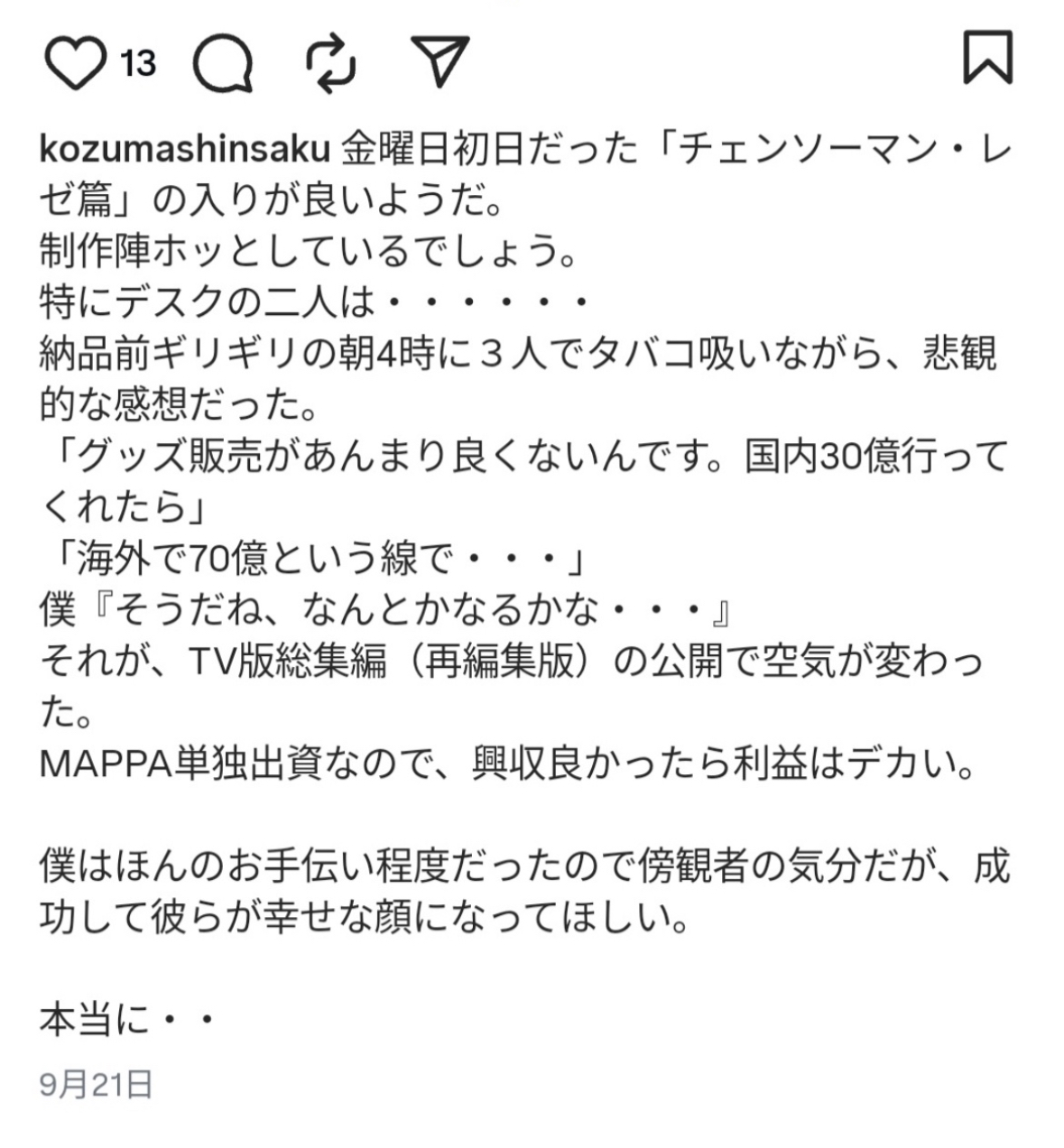 | … | 25025/11/09(日)00:20:42No.1370810423そうだねx1>今年一番の予想外のヒットは間違いなく国宝 |