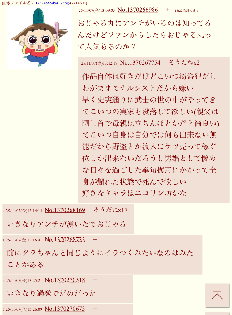 | … | 1225/11/10(月)06:05:59No.1371218725+おじゃる丸アンチの本場ってなん実っていう弱男の巣らしいな |