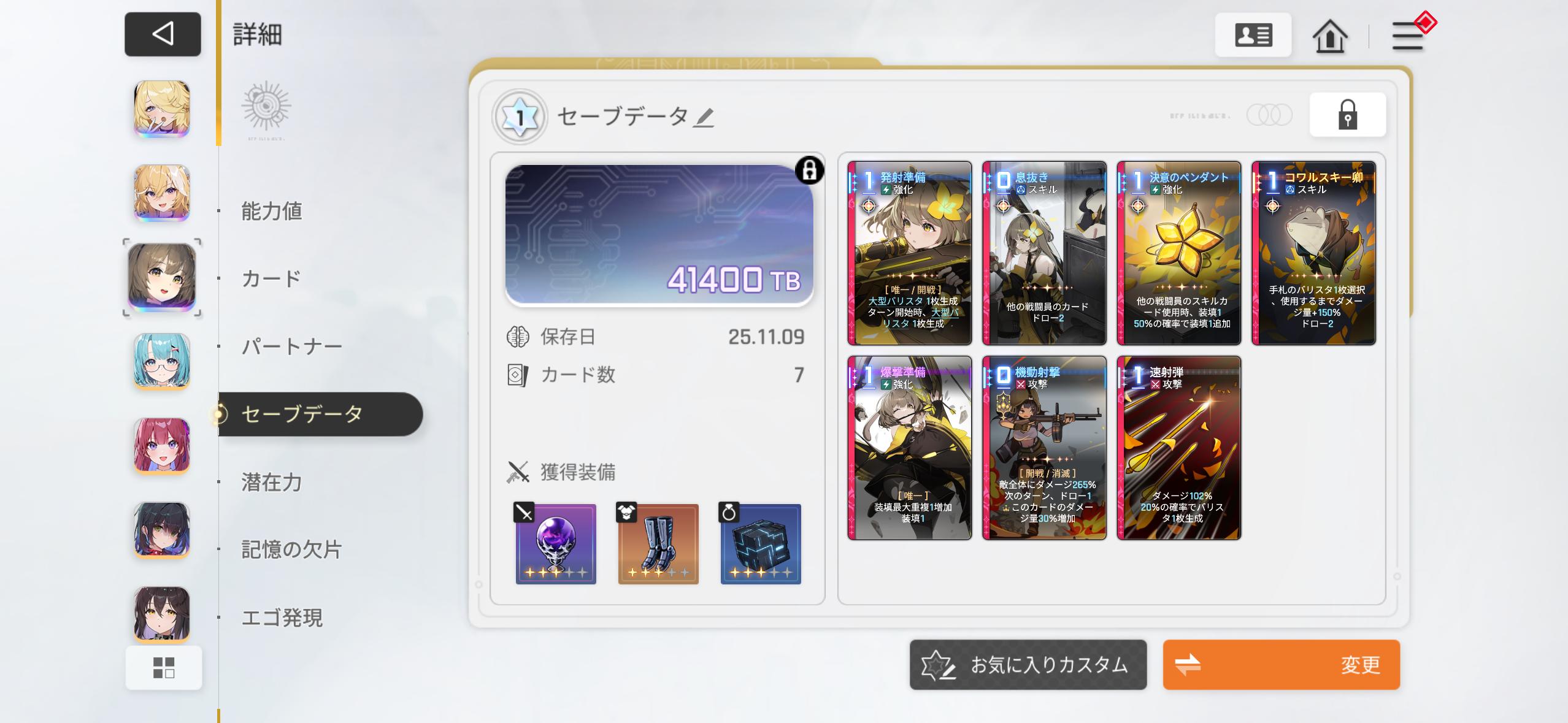 | … | 8725/11/10(月)17:57:54No.1371342438+>セーブデータは装備とか諸々の込みの数値とは別にカードだけで評価値計算して取捨選択してるってこと? ぱい |