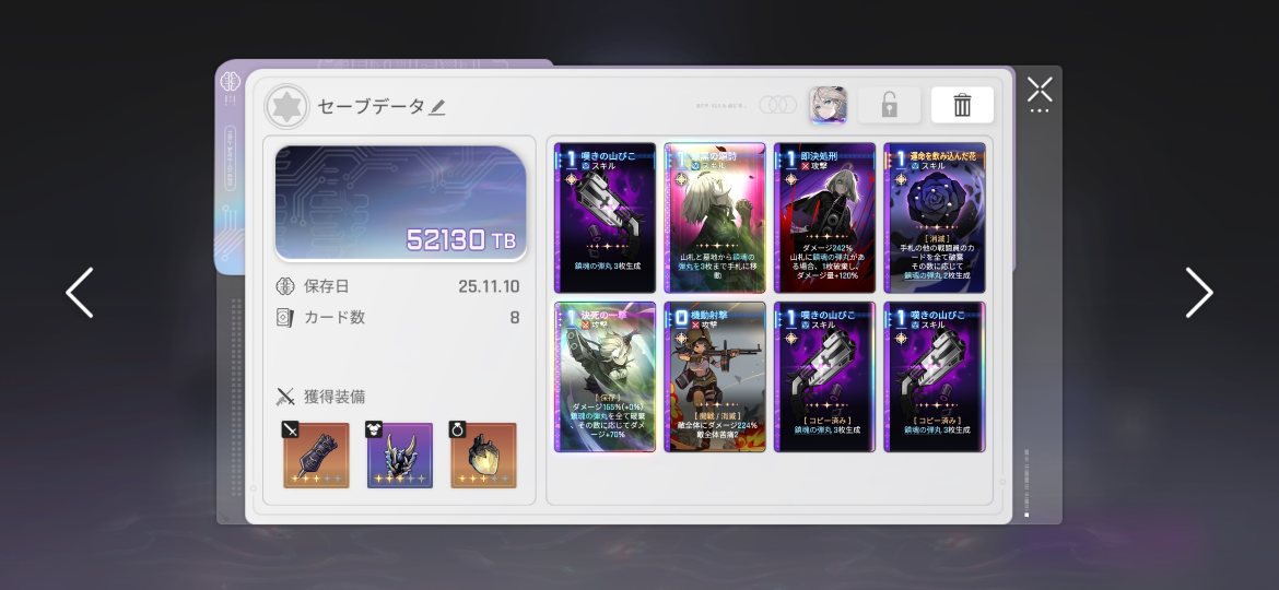 | … | 9325/11/10(月)17:58:34No.1371342616+データ量増えるだけでデッキのカードが戻ったりする処理とは関係ないって思ってるから全員装備埋めてる |