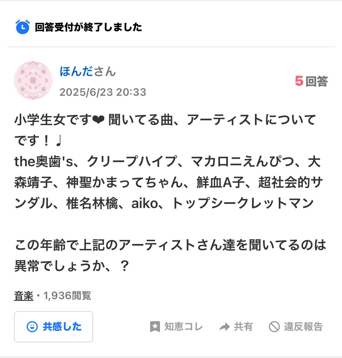 | … | 9325/11/10(月)19:07:25No.1371362498+>小学校女児が聞いてて異常者扱いされる音楽ってなんだよ |