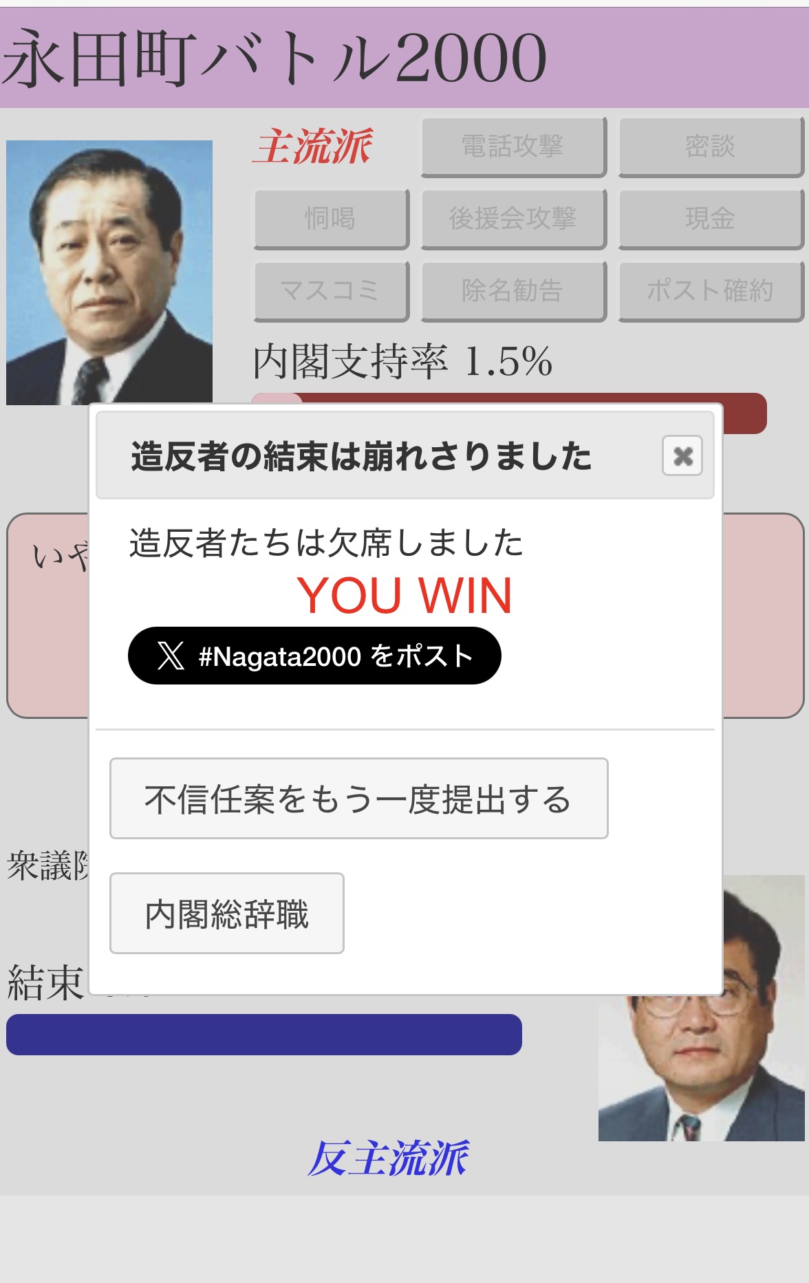このゲームの元ネタの事件が起こる前は首謀者の加藤とあともう一人と小泉が次の総理候補だった(特に加藤が次の総理候補の有力者)