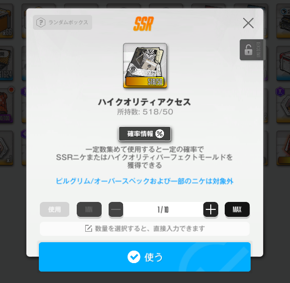 | … | 9125/11/12(水)22:15:33No.1372040073+ハイクオリティアクセスにピルグリムは入んないしバニーミルクとかニンジャとか入ったから全部開けちゃおってやったけど |