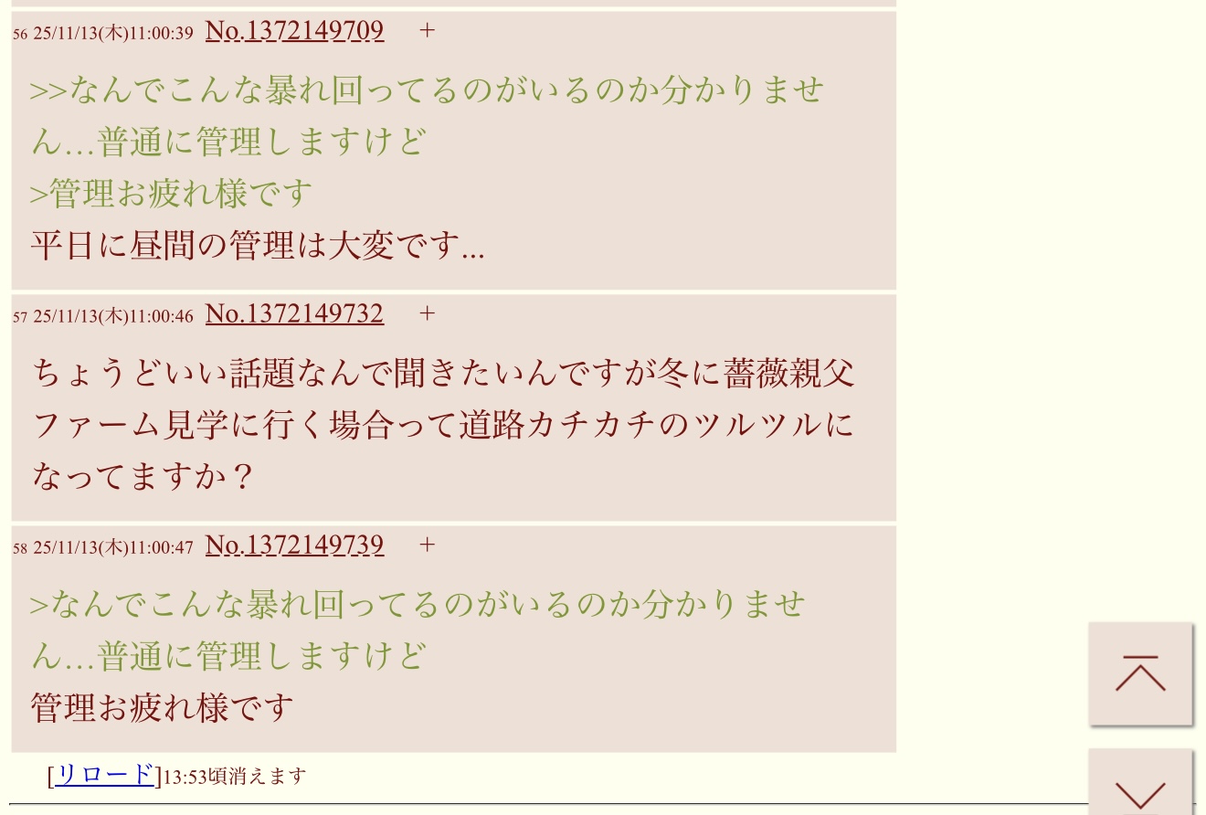 | … | 24525/11/13(木)11:54:02No.1372160390そうだねx2牧場荒らしてるやつがカチンと来てスレ荒らして潰してスレ立て直しですか |