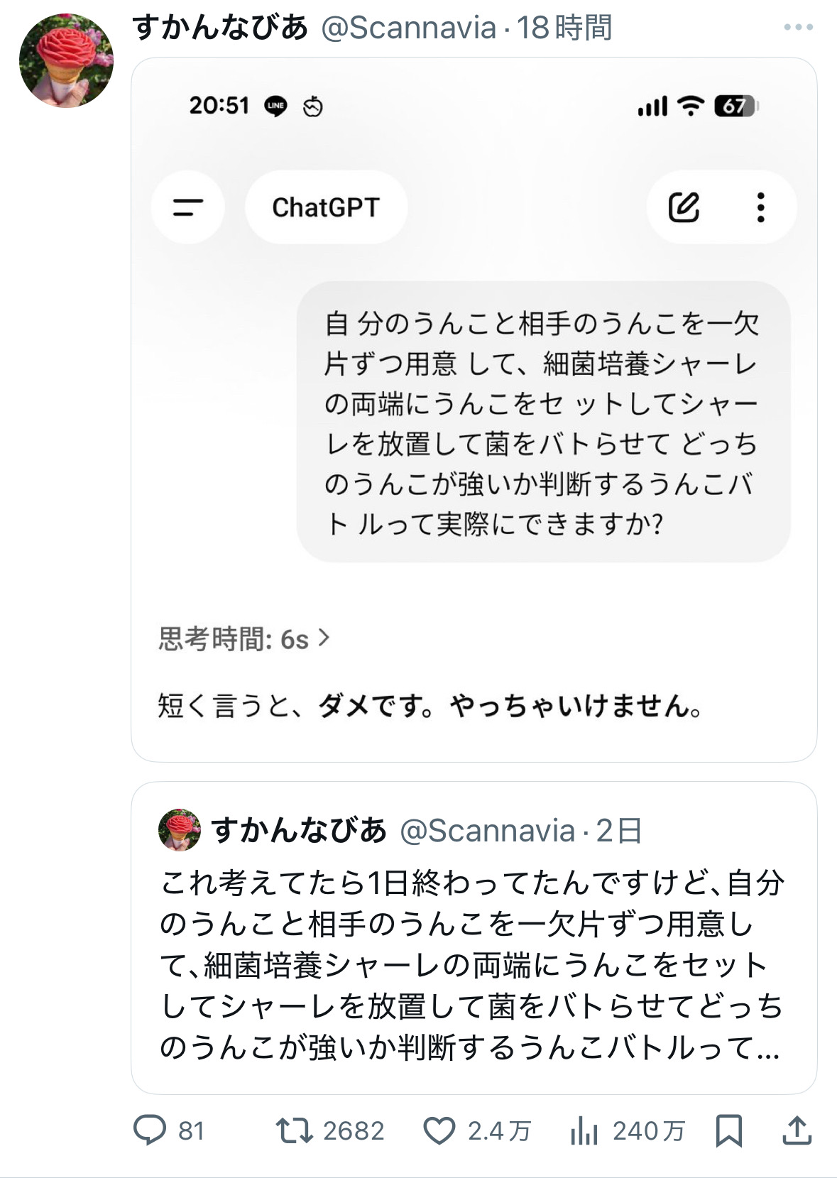 | … | 625/11/13(木)16:00:11No.1372219273+菌同士のバトルの結果生まれてくるスーパーうんこ菌の脅威まで深くシミュレーションするのに6秒かかったんだろう |